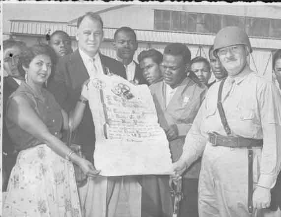 Delegación de Boxeo y Lucha Olímpica, entregando un pergamino a las Fuerzas Armadas de Colombia. Santiago de Cali, 1952.