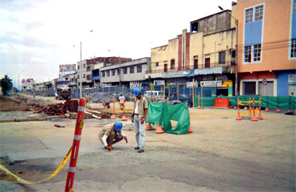 Plano general de contexto. Exterior día. Obra del MIO. Sujetos en centro de enfoque. Realce de texturas de ladrillos, barras separadoras, plásticos verdes.