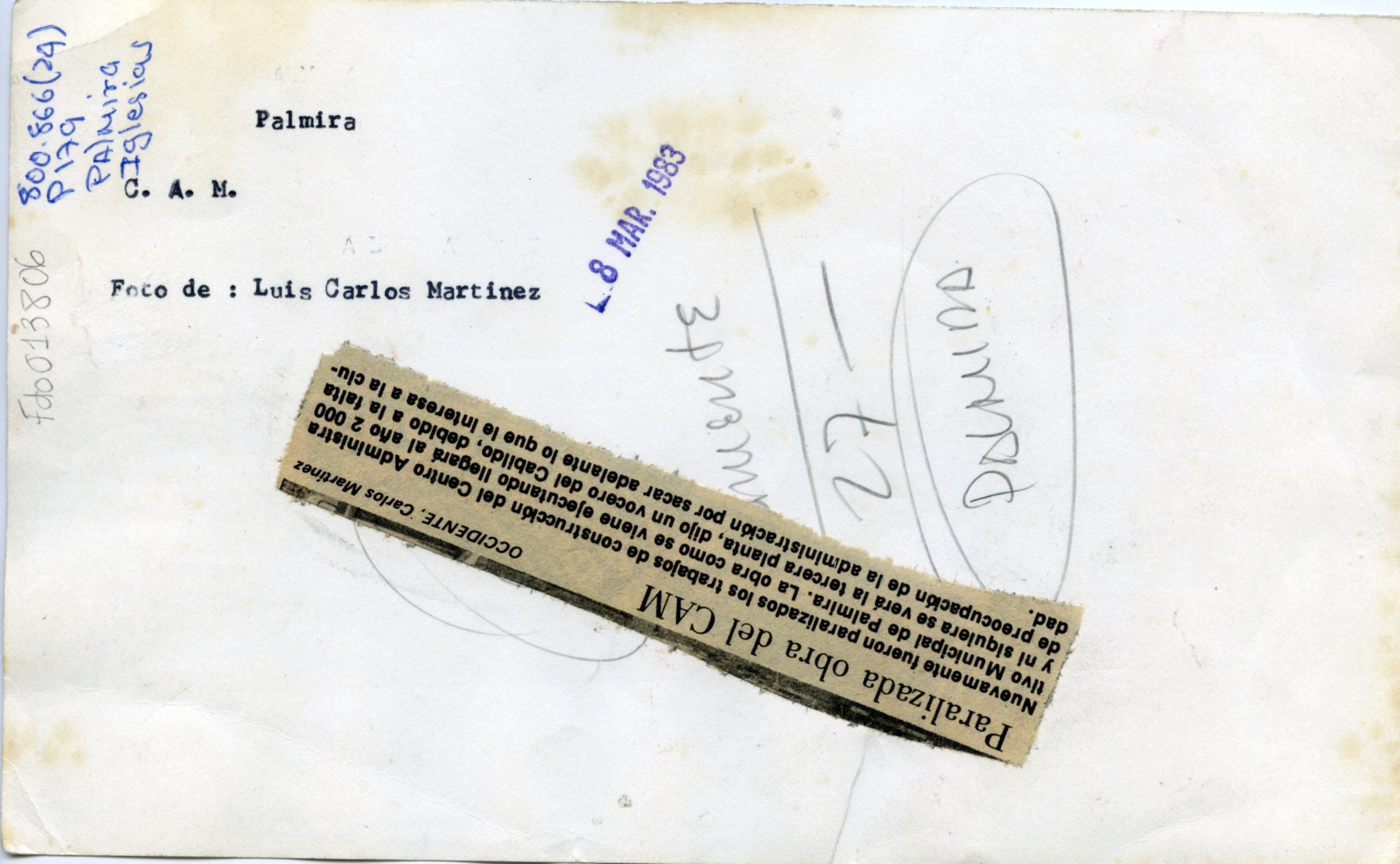 Al reverso de la fotografía se anexa el recorte." Nuevamente fueron paralizados los trabajos de construcción del centro administrativo municipal de Palmira. La obra como se viene ejecutando llegará al año 2000 y ni siquiera se verá la tercera planta, dijo un vocero del cabildo, debido a la falta de precaución de la administración por sacar adelante lo que le interesa a la ciudad".
