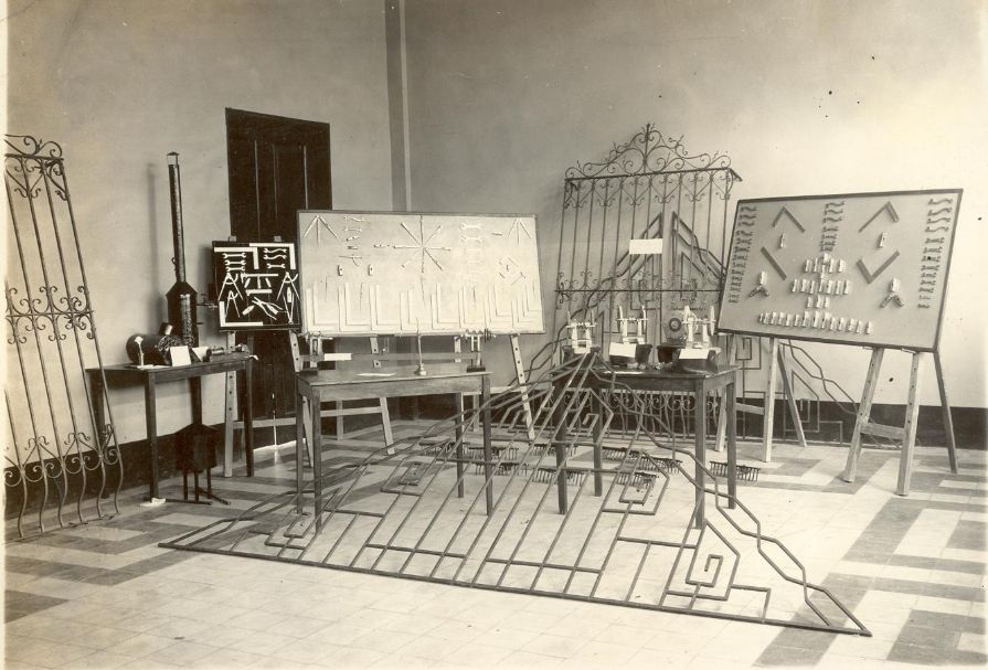 Escuela de Artes y oficios. Exposición de los trabajando elaborados por estudiantes del taller de metalistería. Esta institución se creo por Acuerdo Municipal No 25 de 1933, que ordeno construir una escuela de formación técnico-práctica, para dar respuesta a la necesidad de mano de obra capacitada, requerida por el crecimiento industrial y urbano de la ciudad. A partir de 1945 se le empezo a llamar Instituto Antonio José Camacho. Actualmente lo conocemos como Instituto Educativo Técnico Industrial Antonio José Camacho. Santiago de Cali, 1940.