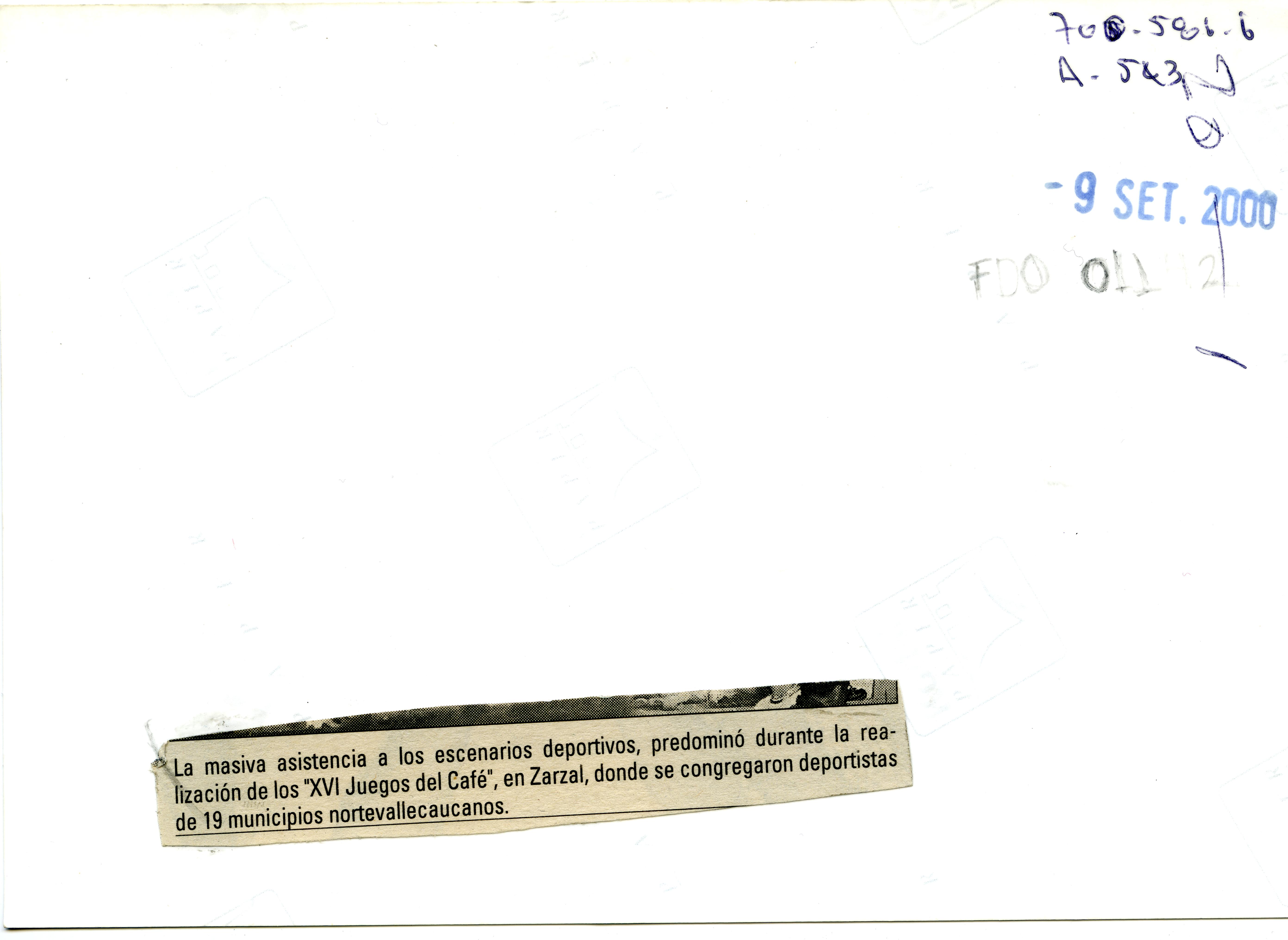 Al reverso de la fotografía se anexa un recorte. " La masiva asistencia a los escenarios deportivos predominó durante la realización de los "XVI Juegos del Café", en Zarzal, donde se congregaron deportistas de 19 municipios norte vallecaucanos.