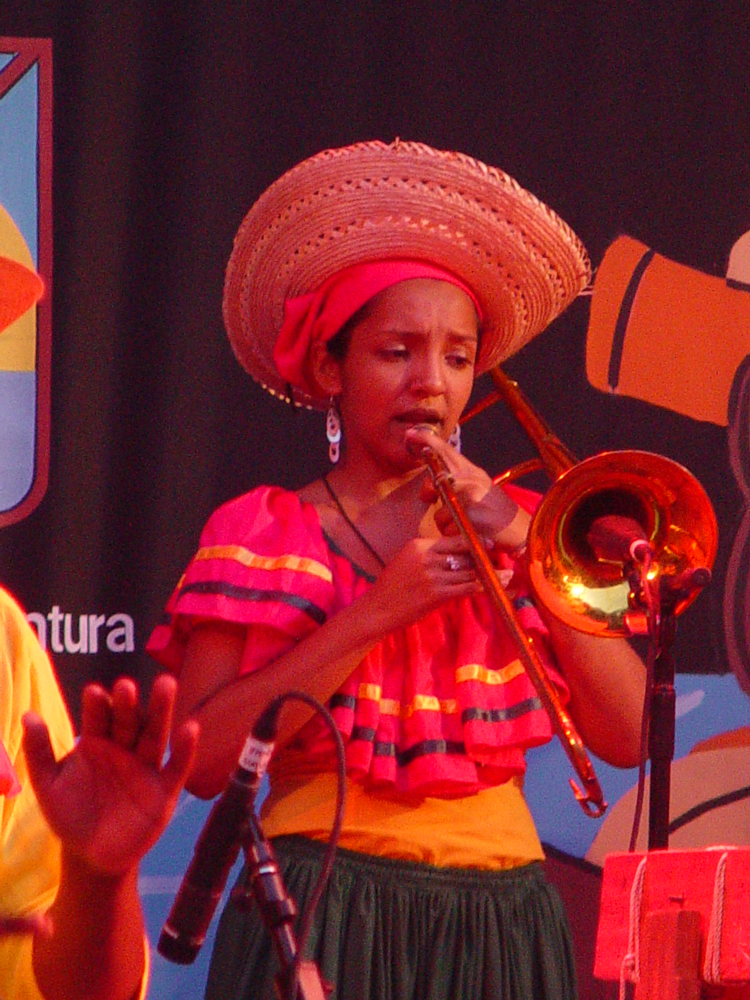 Plano medio de música tocando el trombón, en una presentación musical en el 8 Festival de Música del Pacífico "Petronio Álvarez"