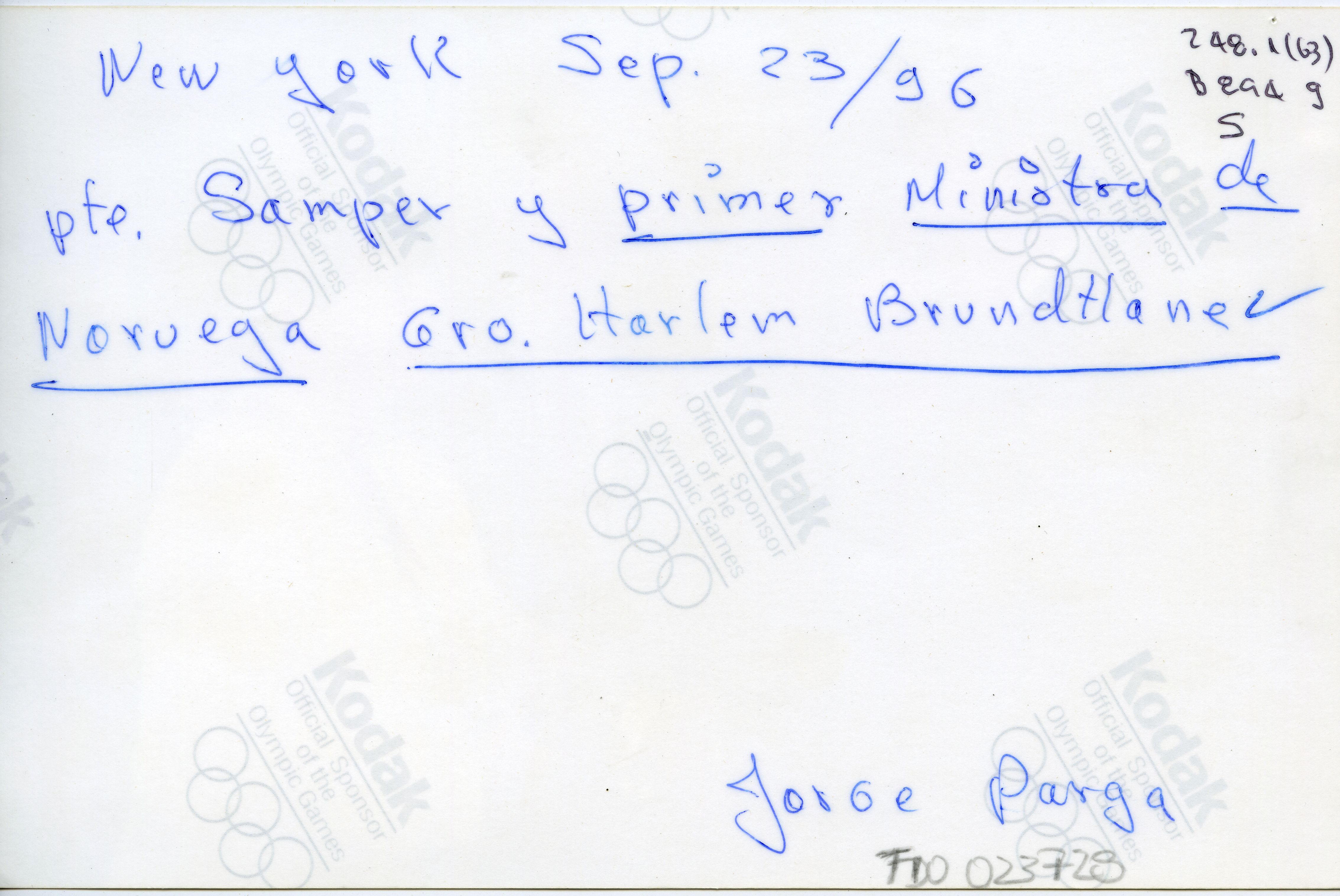 | dc.description.abstract | Presidente, Ernesto Samper Pizano y primer ministra Noruega, Harlem Brundtlane. Se precia al presidente saludando a la ministra | spa |
