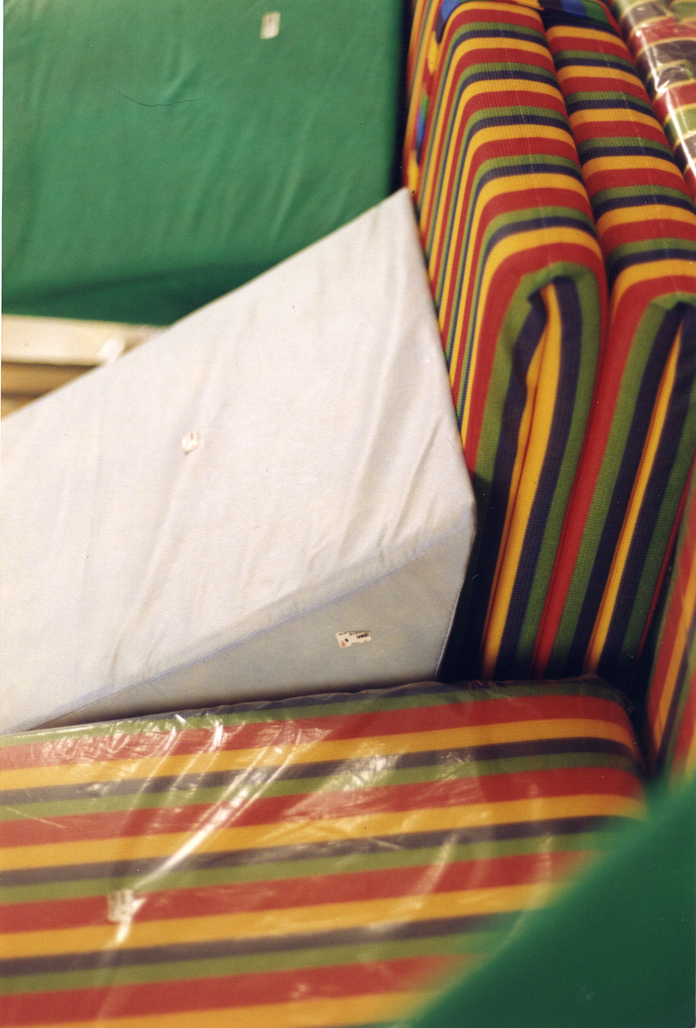 Imagen en primer plano de colchonetas de camping, con rayas verticales de diferentes colores, se observa una en bolsa transparente, lo mismo que una almohada de color blanca y de forma geométrica o triangular.