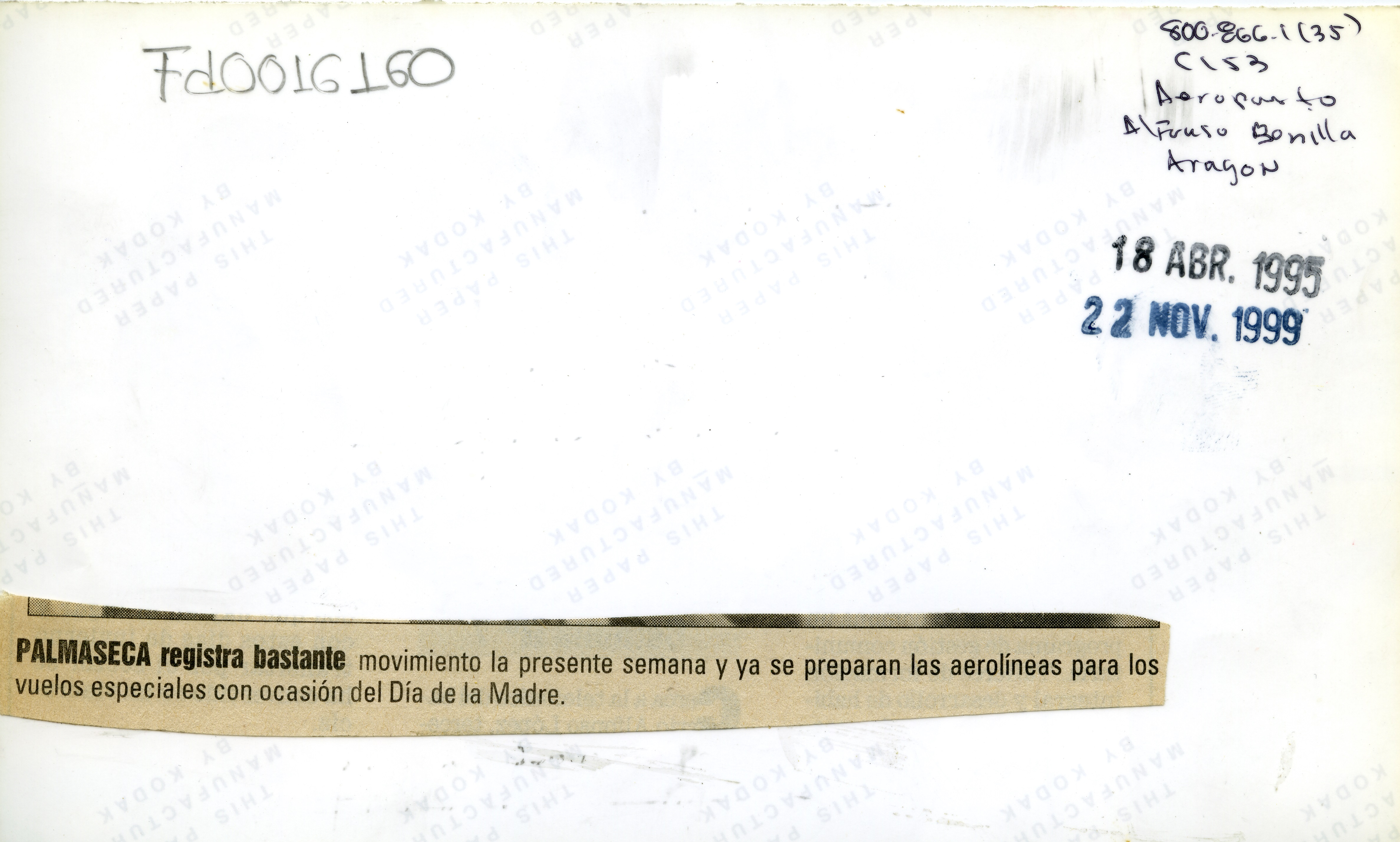 | dc.description.abstract | Al reverso de la fotografía se anexa recorte: "PALMASECA registra bastante movimiento la presente semana y ya se preparan las aerolíneas para los vuelos especiales con ocasión del Día de la Madre" | spa |