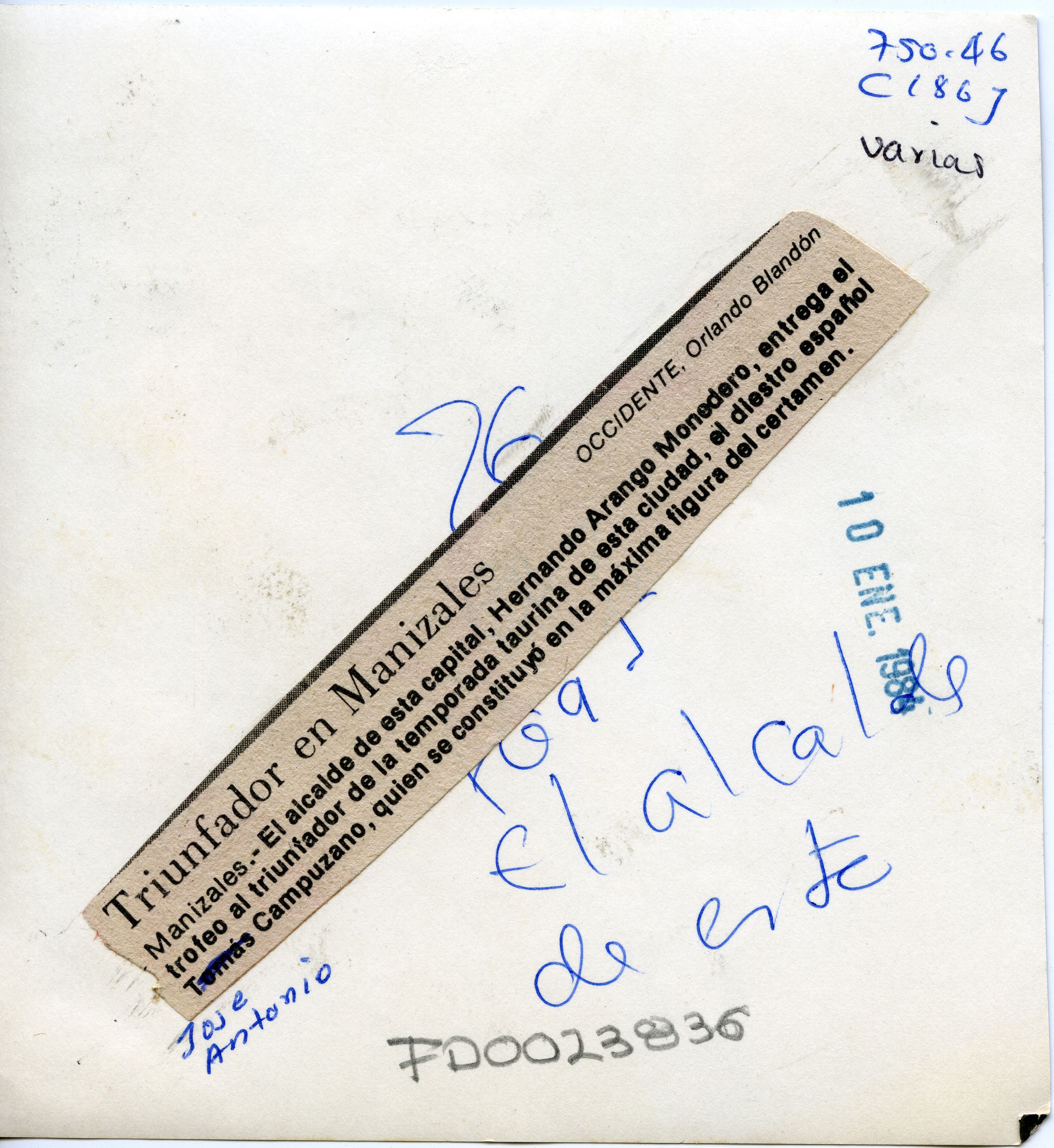 Al reverso de la fotografía se anexa recorte: Triunfador en Manizales. Manizales. El alcalde de esta capital, Hernando Arango Monedero, entrega el trofeo al triunfador de la temporada taurina de esta ciudad, el diestro español Campuzano, quien se constituyó en la máxima figura del certamen