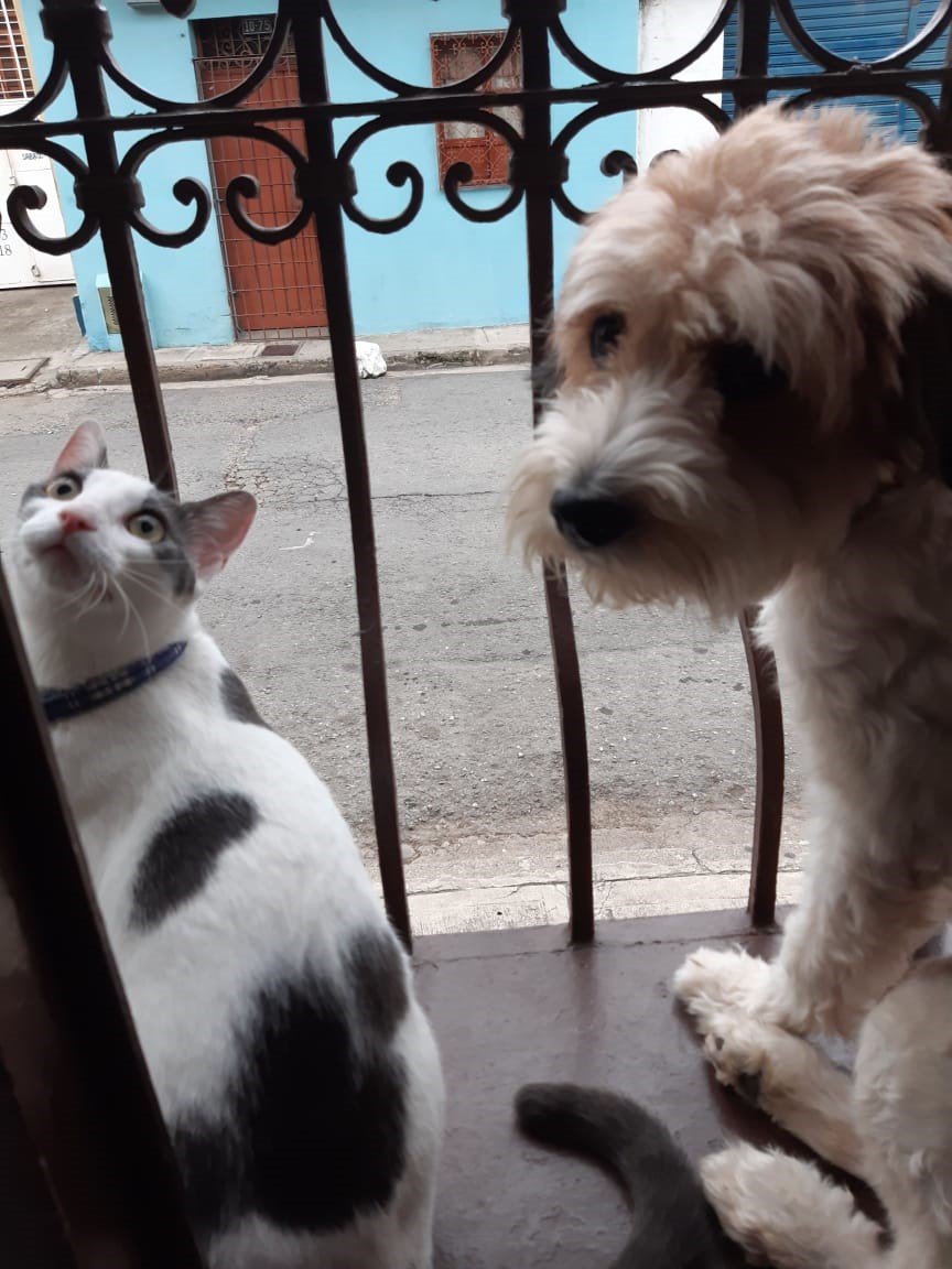 Se observan un perro y un gato tras una ventana, afuera se divisa la calle.