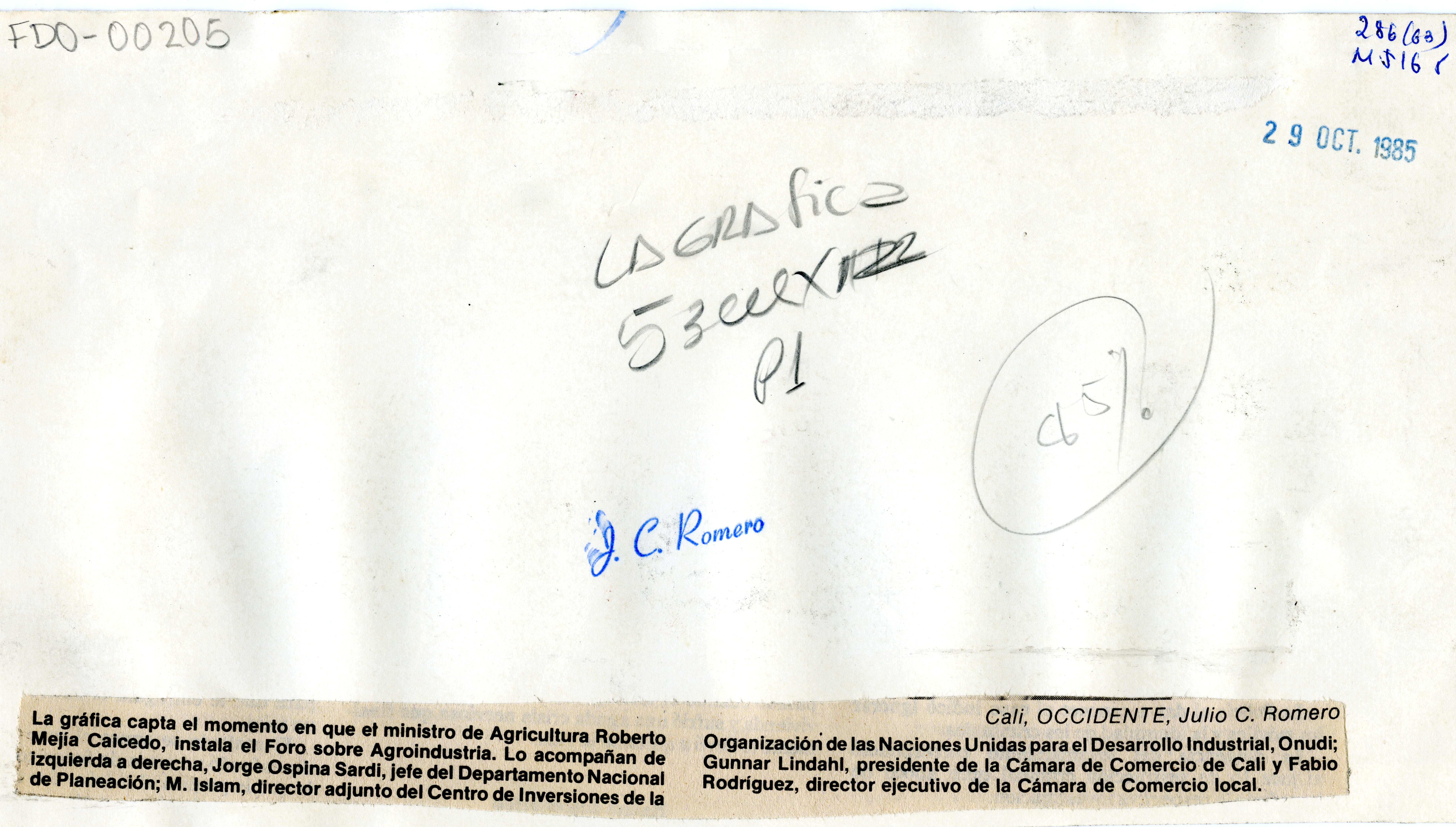 Instalación del Foro de Agroindustria a cargo del Ministro de Agricultura, Roberto Mejía Caicedo. El Archivo del Patrimonio Fotográfico y Fílmico del Valle del Cauca es responsabilidad de la Biblioteca Departamental del Valle Jorge Garcés Borrero, por convenio de cooperación suscrito con la Secretaria del Cultura Departamental, con el fin de aunar esfuerzos para su conservación, preservación y divulgación del Archivo entre la comunidad Vallecaucana, especialmente entre los estudiantes e investigadores que visitan la Biblioteca, propiciando el uso y consulta permanente. La universidad Icesi es un colaborador en el proceso de difusión, facilitando la tecnología que permite la consulta de las imágenes.