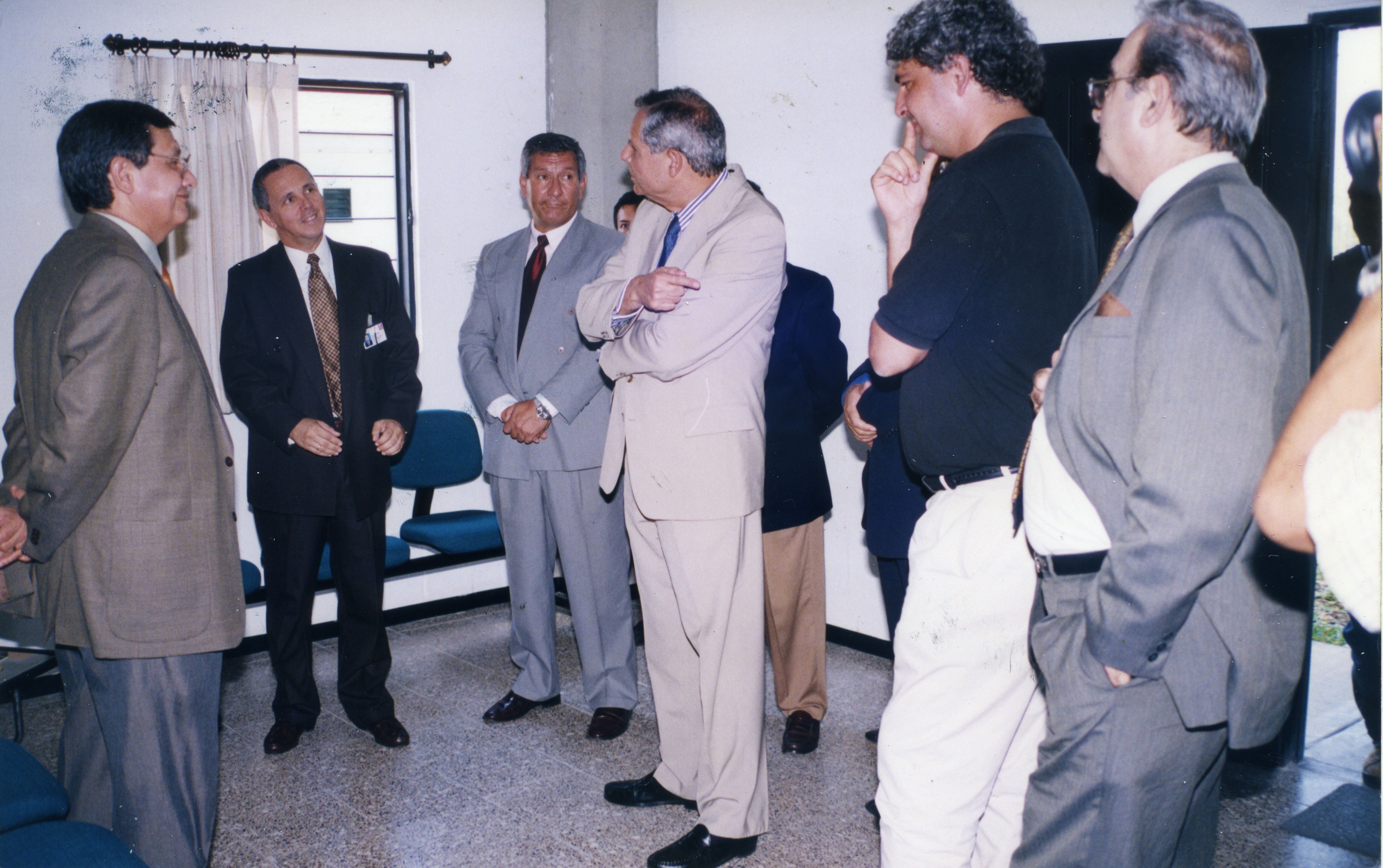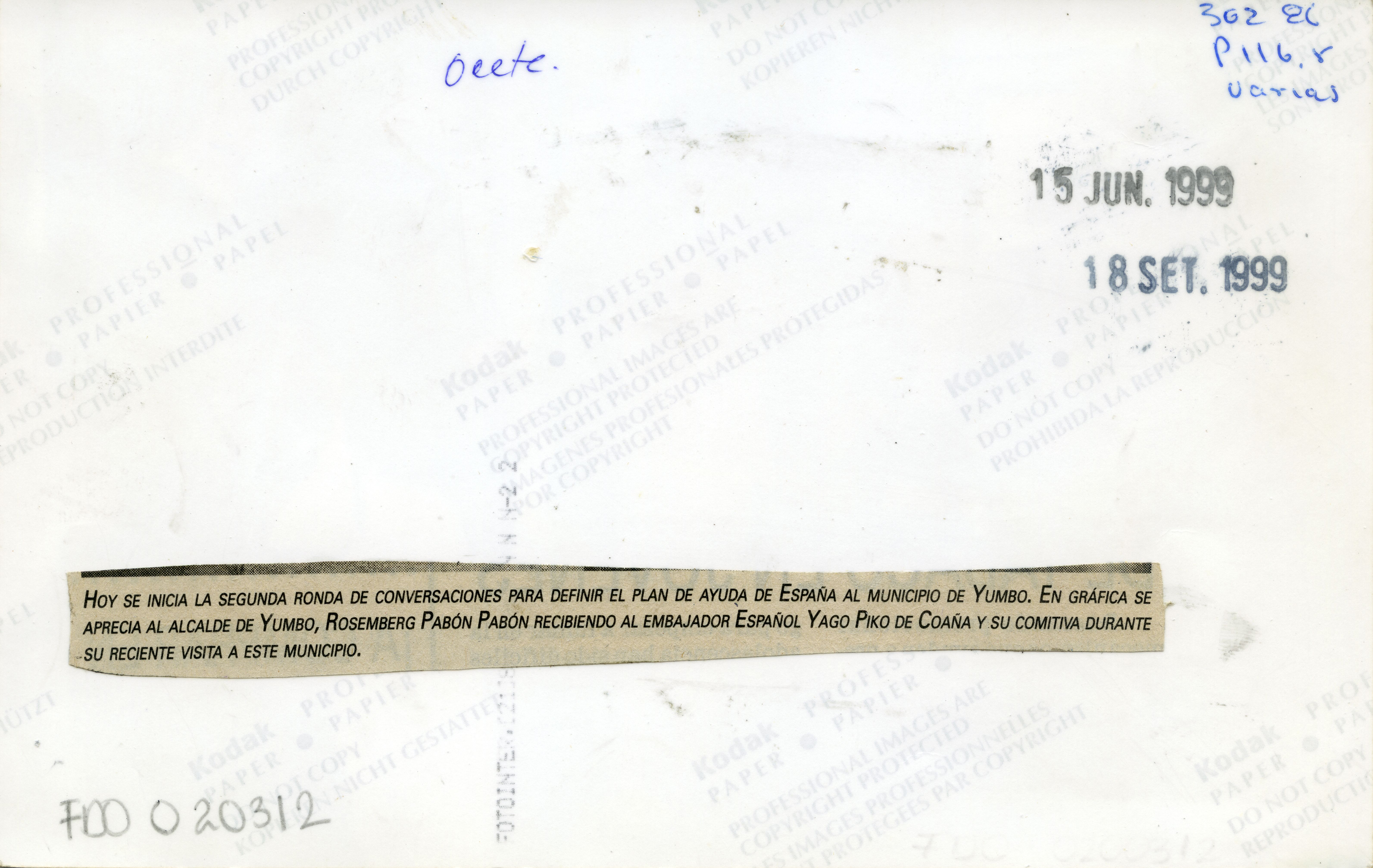 En la fotografía podemos observar al alcalde de Yumbo, Rosemberg Pabón Pabón recibiendo la visita del embajador español Yago Piko de Coaña y sus acompañantes en la ciudad industrial. Al reverso de la fotografía se anexa recorte: "Hoy se inicia la segunda ronda de conversaciones para definir el plan de ayuda de España al municipio de Yumbo. En la gráfica se aprecia al alcalde de Yumbo, Rosemberg Pabón Pabón recibiendo al embajador español Yago Piko de Coaña y su comitiva durante su reciente visita a este municipio."