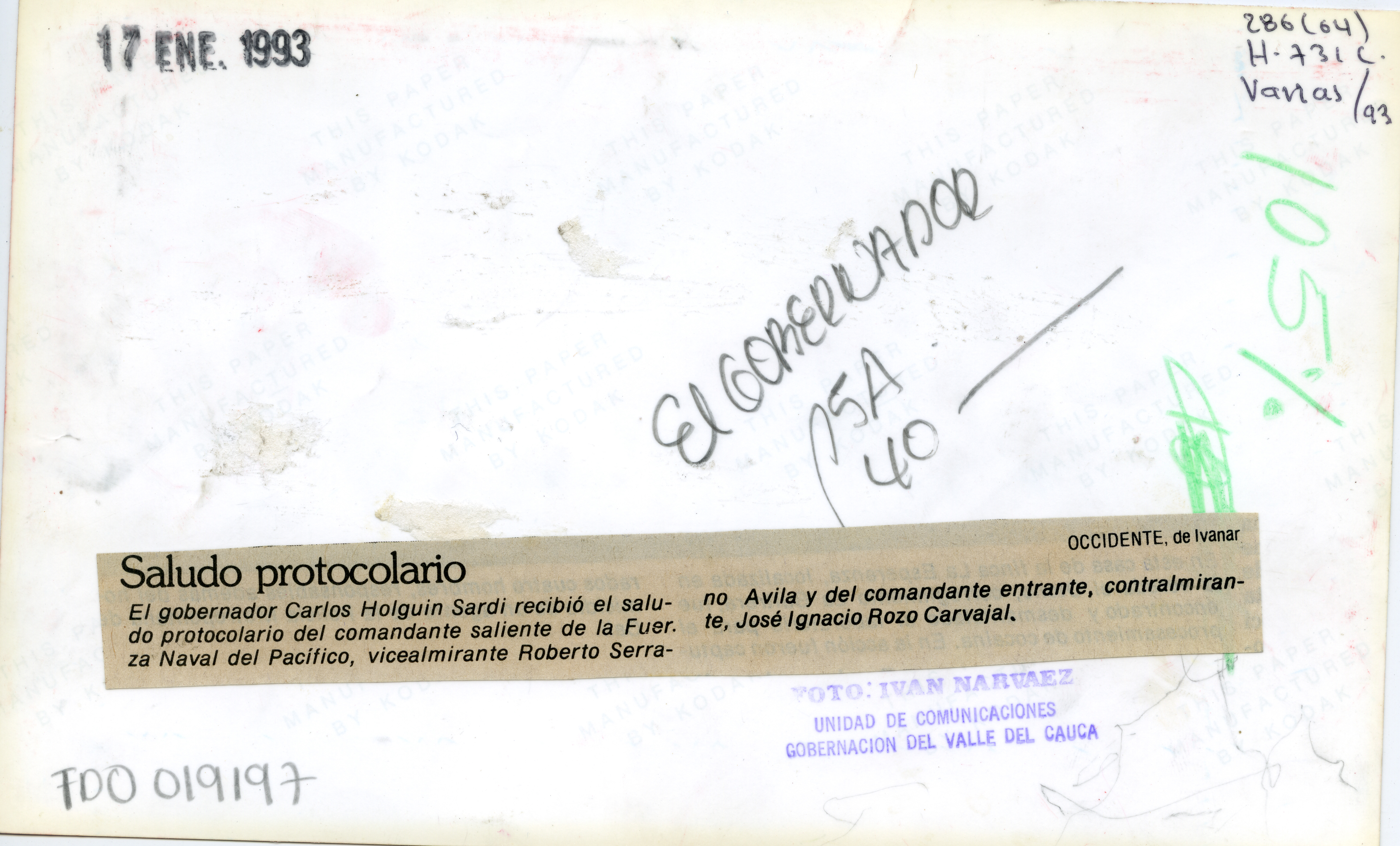En la fotografía podemos observar al Gobernador del Valle, Carlos Holguín Sardi, reunido con dos miembros de la Fuerza Naval del Pacífico, estrechándose la mano, haciendo el saludo protocolario pertinente. Al reverso de la fotografía se anexa recorte: "Saludo protocolario. El Gobernador Carlos Holguín Sardi recibió el saludo protocolario del comandante saliente de la Fuerza Naval del Pacífico, vicealmirante Roberto Serrano Avila y del comandante entrante, contralmirante, José Ignacio Rozo Carvajal."