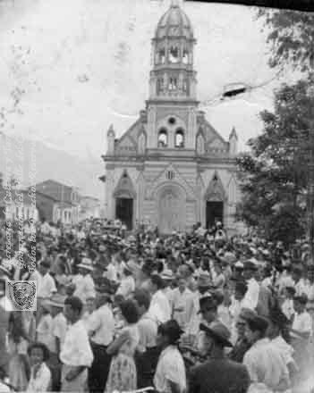 OBDALUCIA AGREDO DE AFANADOR (1954). El pueblo de pradera en la Celebración de las fiestas decembrinas, al fondo la Iglesia Inmaculada & 402086. PRADERA: Biblioteca Departamental Jorge Garces Borrero.