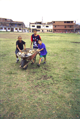 Plano general. Dos infantes y un adolescente llevan una carreta con desechos encontrados en el campo deportivo. Los niños miran a cámara. Al fondo edificaciones. Exterior día.