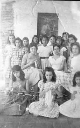 Grupo de alumnas y su profesora en una clase de costura. Entre otras alumnas Lucila Colonia, Graciela García, Alicia González y Betty Villafañe. Vijes, 1950.