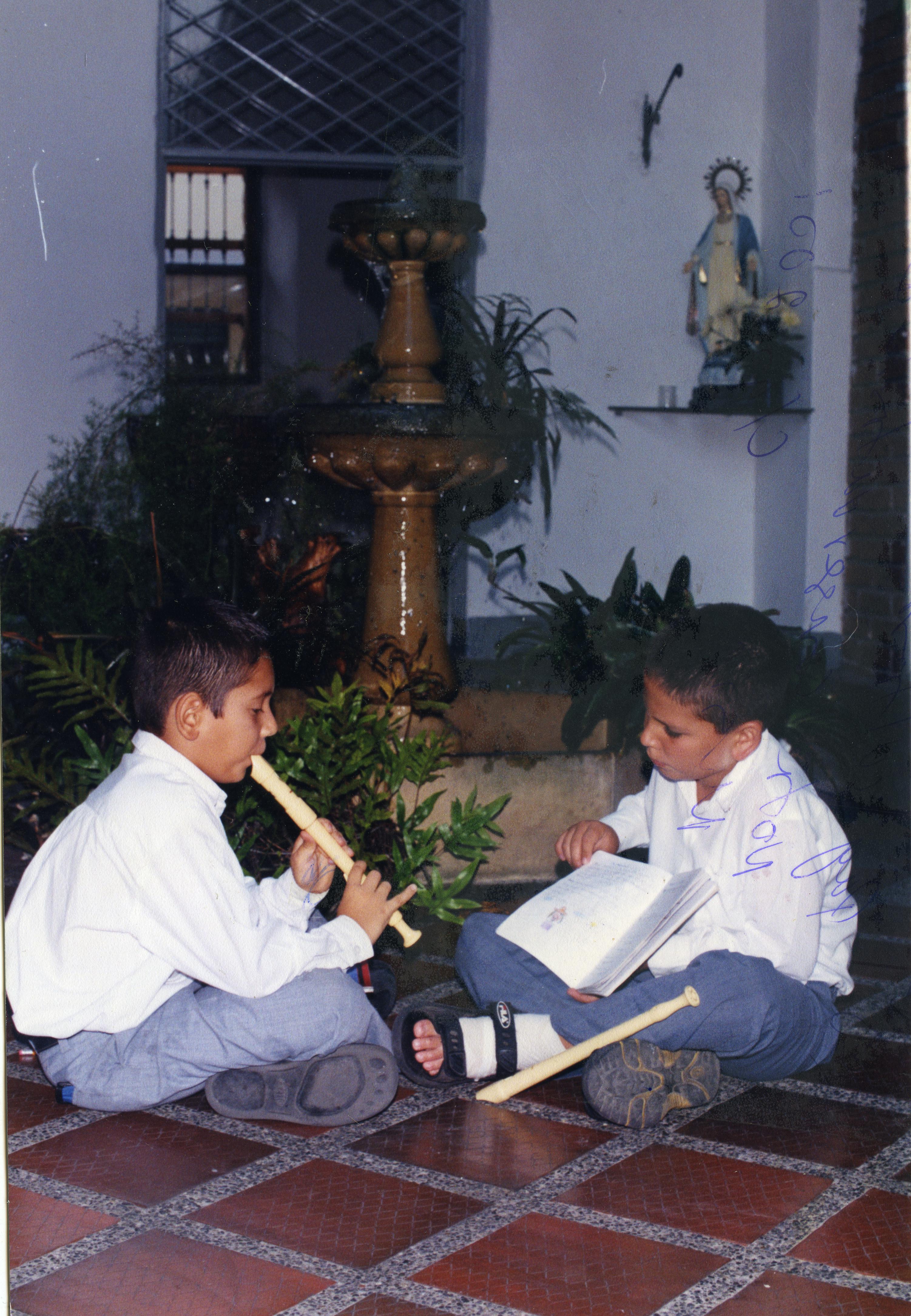 En la gráfica se observan dos niños, uno toca la flauta mientras el otro sostiene un cuaderno abierto para que el primero se guíe. Detrás de ellos una fuente, a la derecha una estatua de la virgen María.