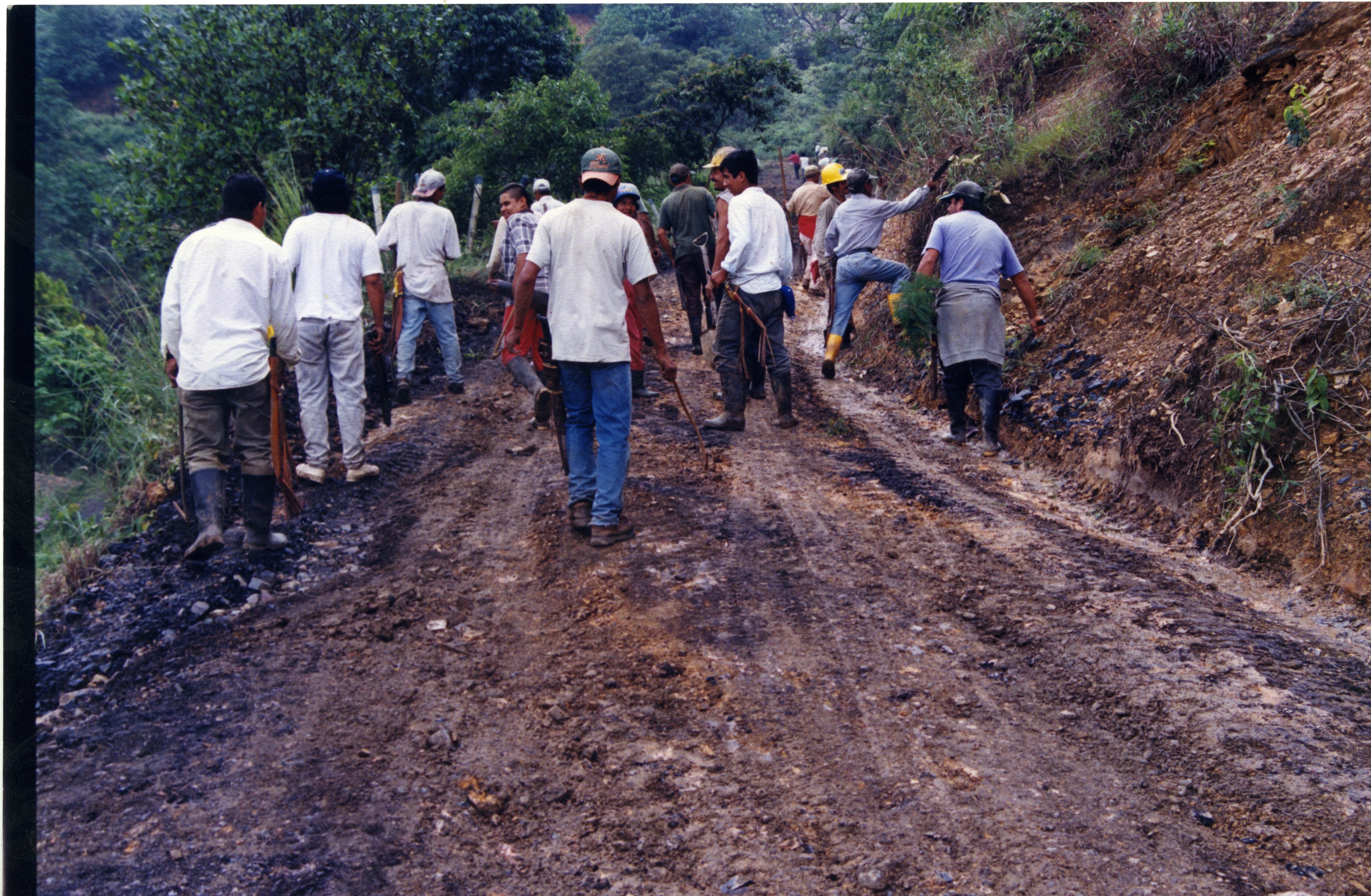 Obreros aplanando vía en construcción