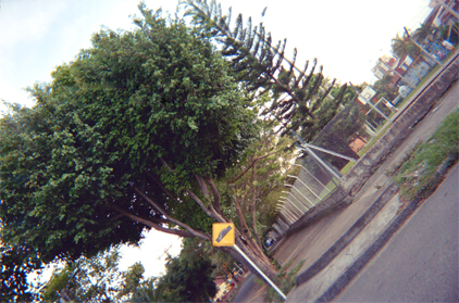 Imagen tomada desde una esquina en el barrio Departamental en la cual se observa zona deportiva con enmallado. Predominio de vegetación en el lado izquierdo. Exterior día. Plano general. Toma diagonal.