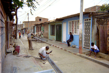 Celorio Vivieros, J. J. (2005). Calle en la que hay varios hombres trabajando en soldadura. Santiago de Cali: Biblioteca Departamental Jorge Garces Borrero.