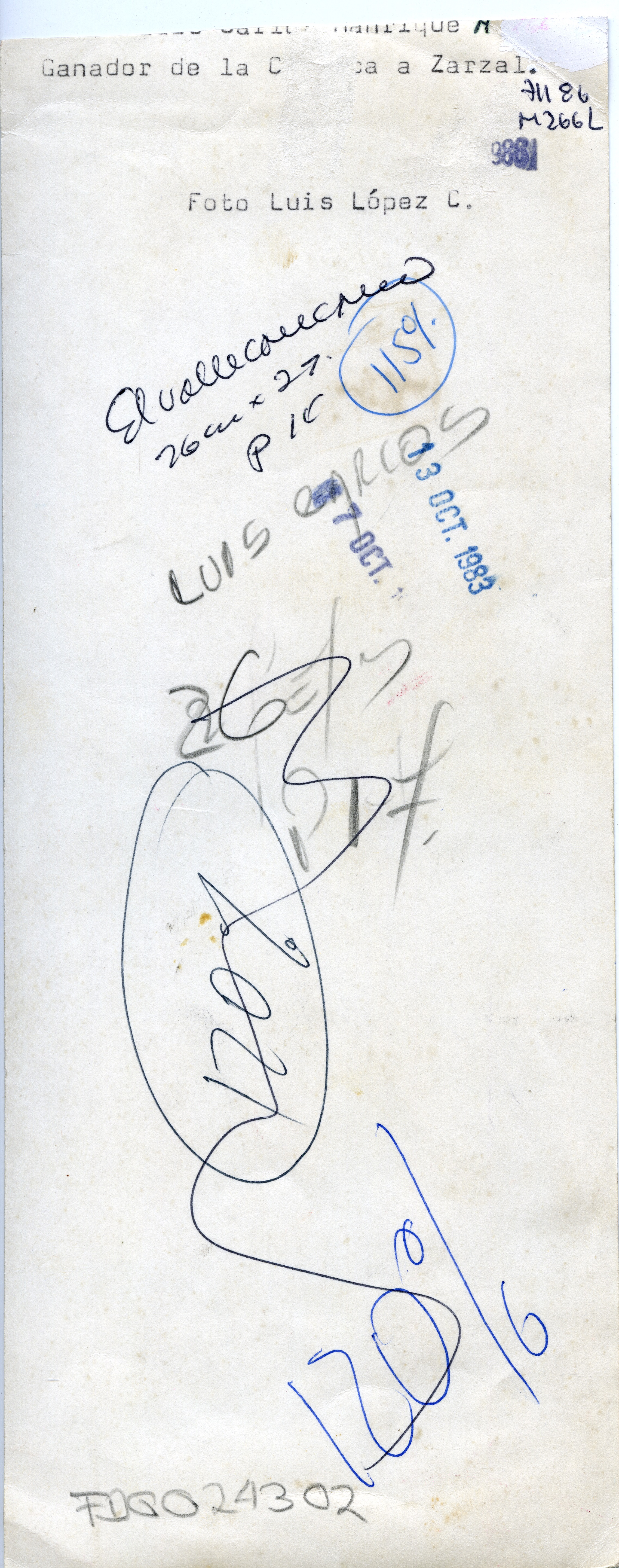 Luis Carlos Manrique, nacido el 8 de septiembre de 1955 en Onzaga, Santander, Colombia. Es un ciclista Colombiano. En la gráfica se aprecia a Manrique celebrando con las manos arriba. En la camiseta dice: Club Almacén El Vaquero Cali