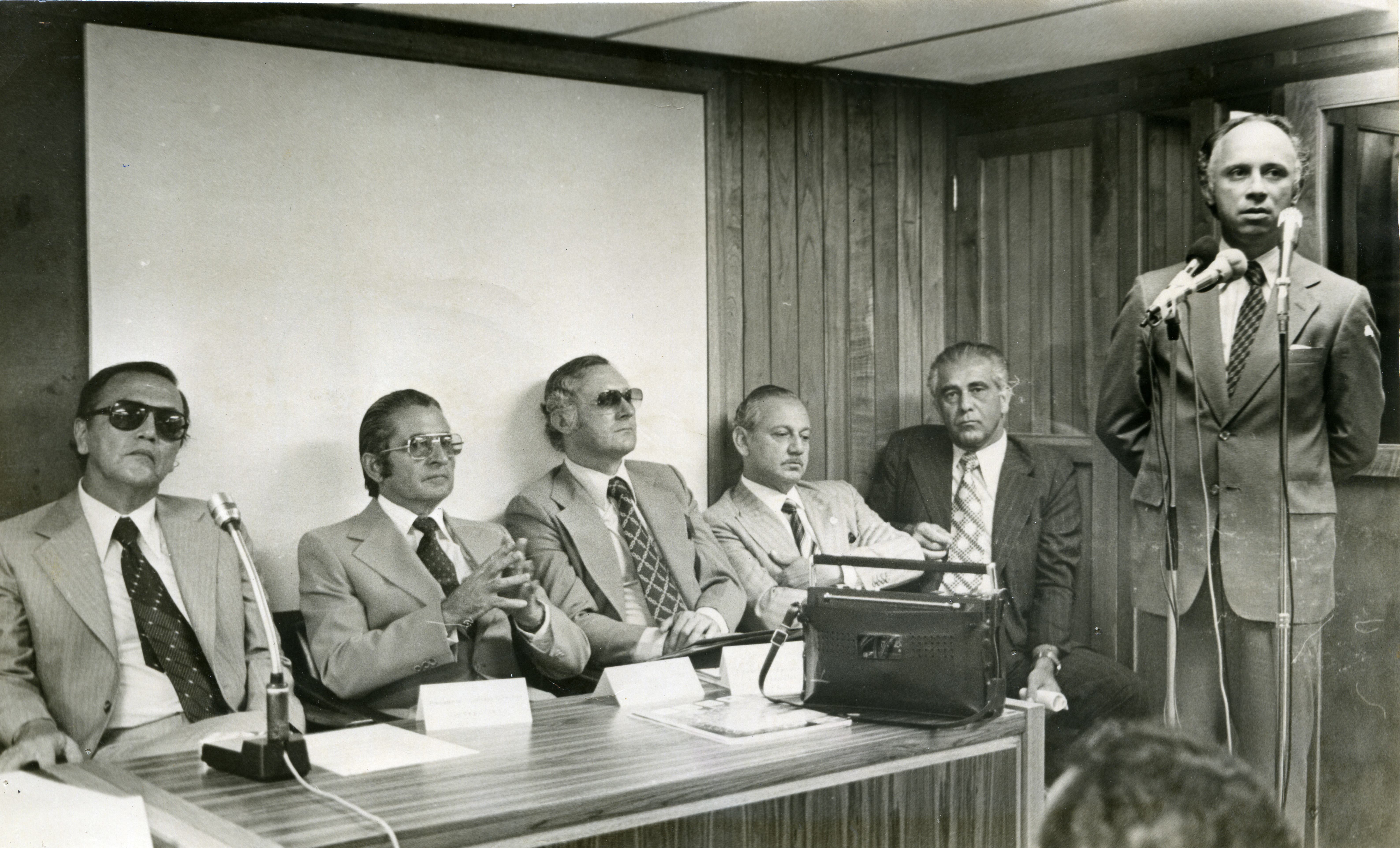 Al reverso de la fotografia se anexa recorte: "El señor ministro de Educación, doctor Rodrigo Lloreda Caicedo, presidió ayer el acto de posesión del comite organizador del IX Campeonato Mundial de Basquetbol Masculino, que se celebrará en Colombia, con Cali como sede principal, en 1982. Al acto asistieron altas autoridades gubernamentales y deportivas"
