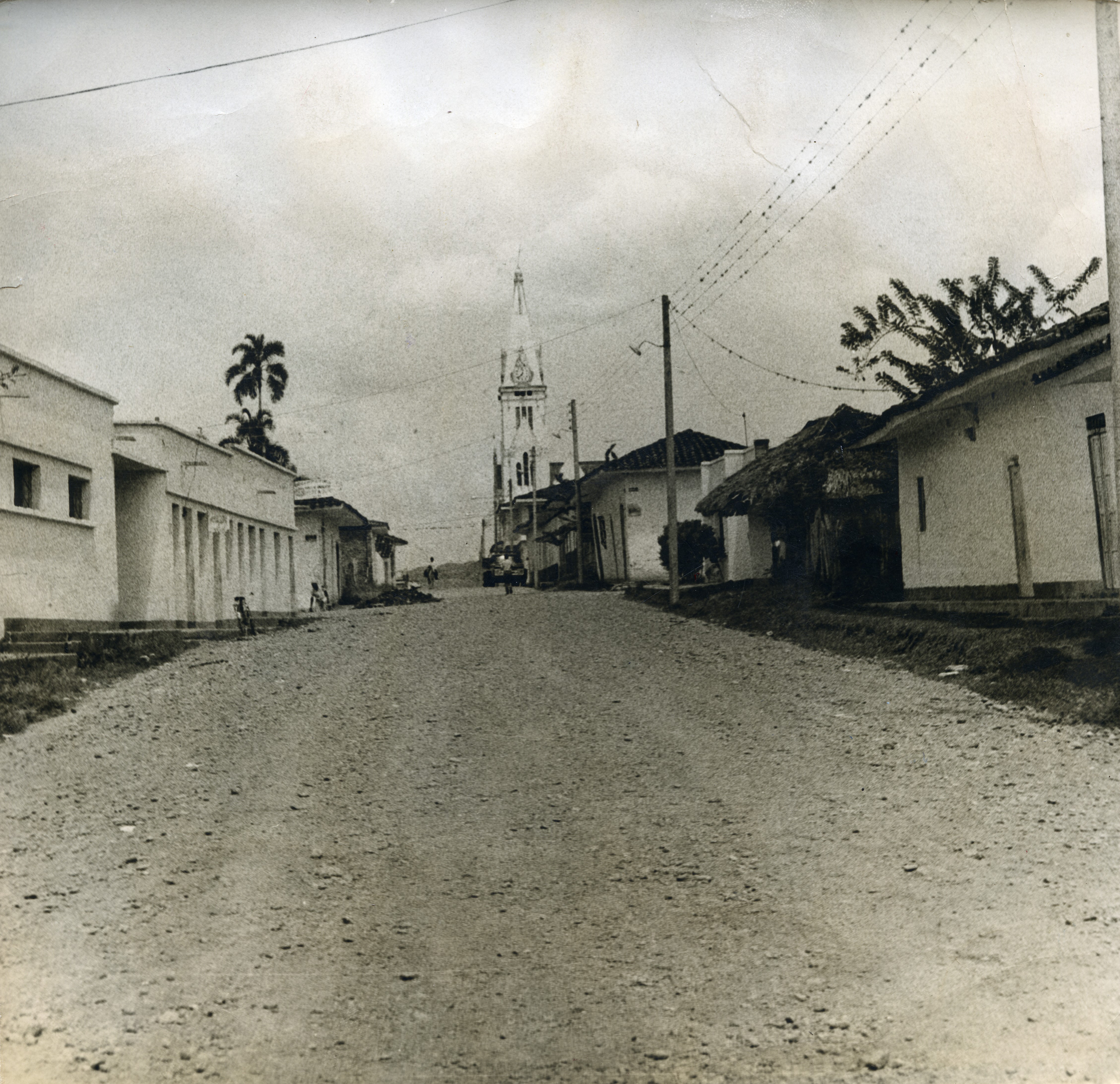 Se observa calle despavimentada, lo que parece parte de la carrera 4 de Andalucía, al fondo se divisa la iglesia.
