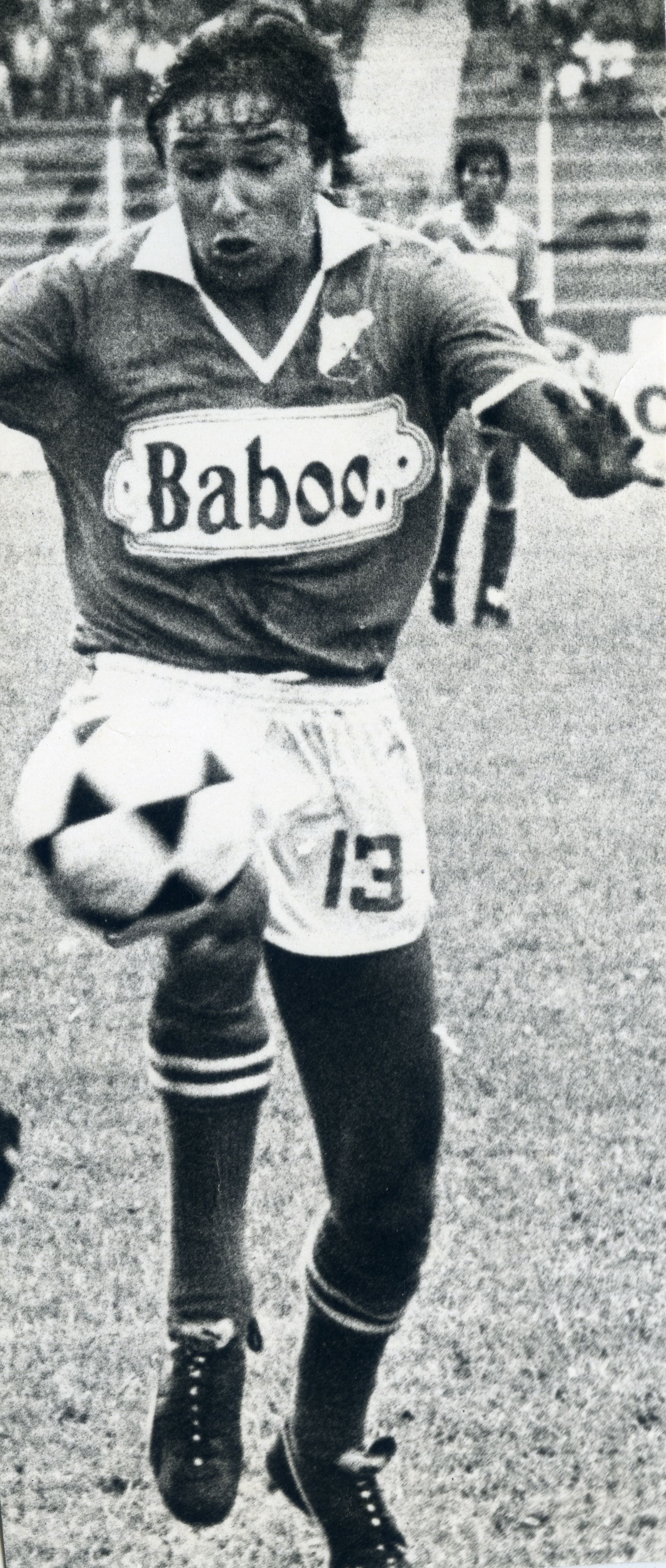 Moisés Pachón, es un exfutbolista y entrenador colombiano que se desempeñó como lateral y jugó en Independiente Santa Fe, Deportivo Cali, Millonarios, y en Deportivo Pereira.Se aprecia al jugador controlar el balón. Observamos en la camiseta que dice Baboo