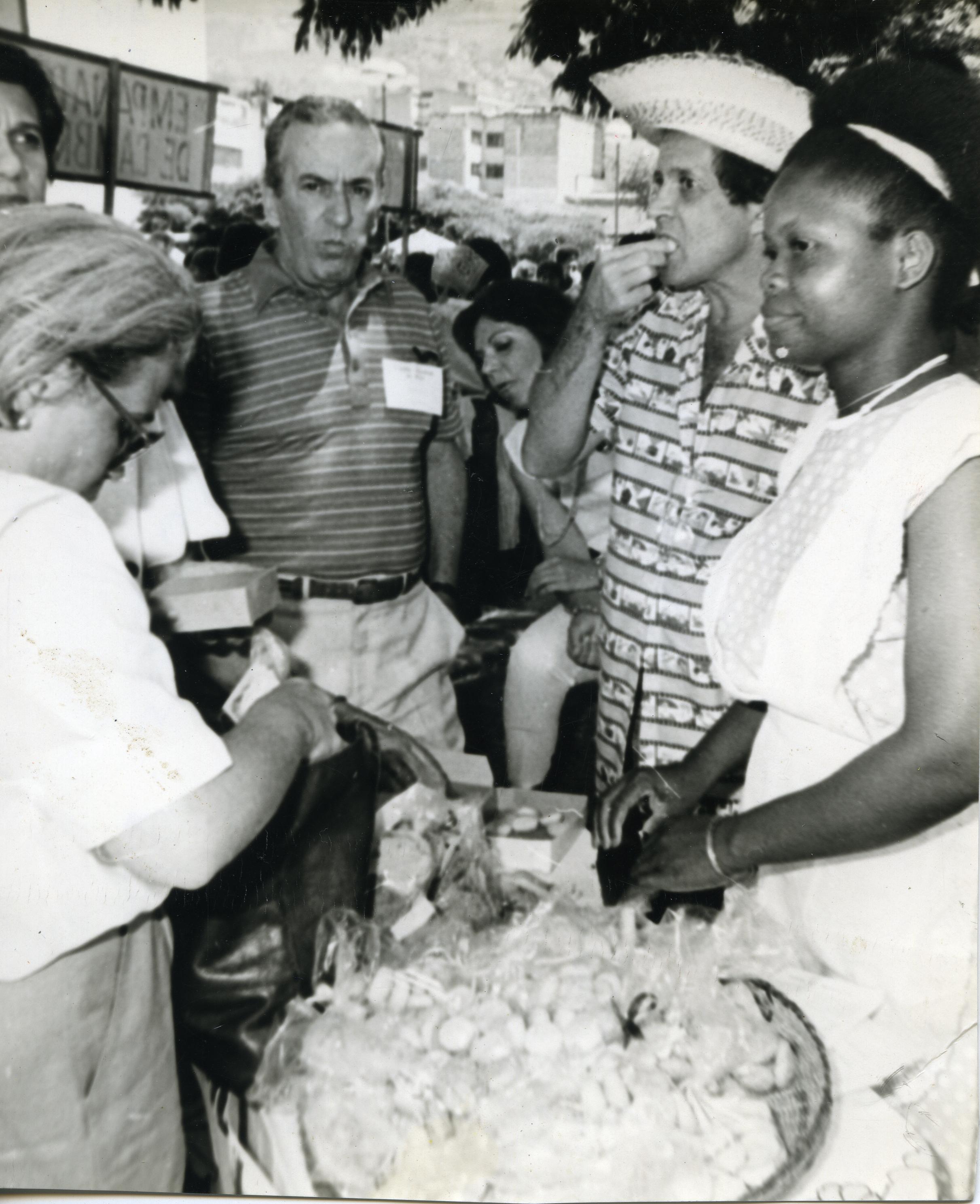 En la gráfica se observan algunas personas reunidas en contexto del II Festival del Mecato celebrado en la ciudad de Cali. Entre las personas se encuentra una mesa y una canasta con diferentes productos gastronómicos.