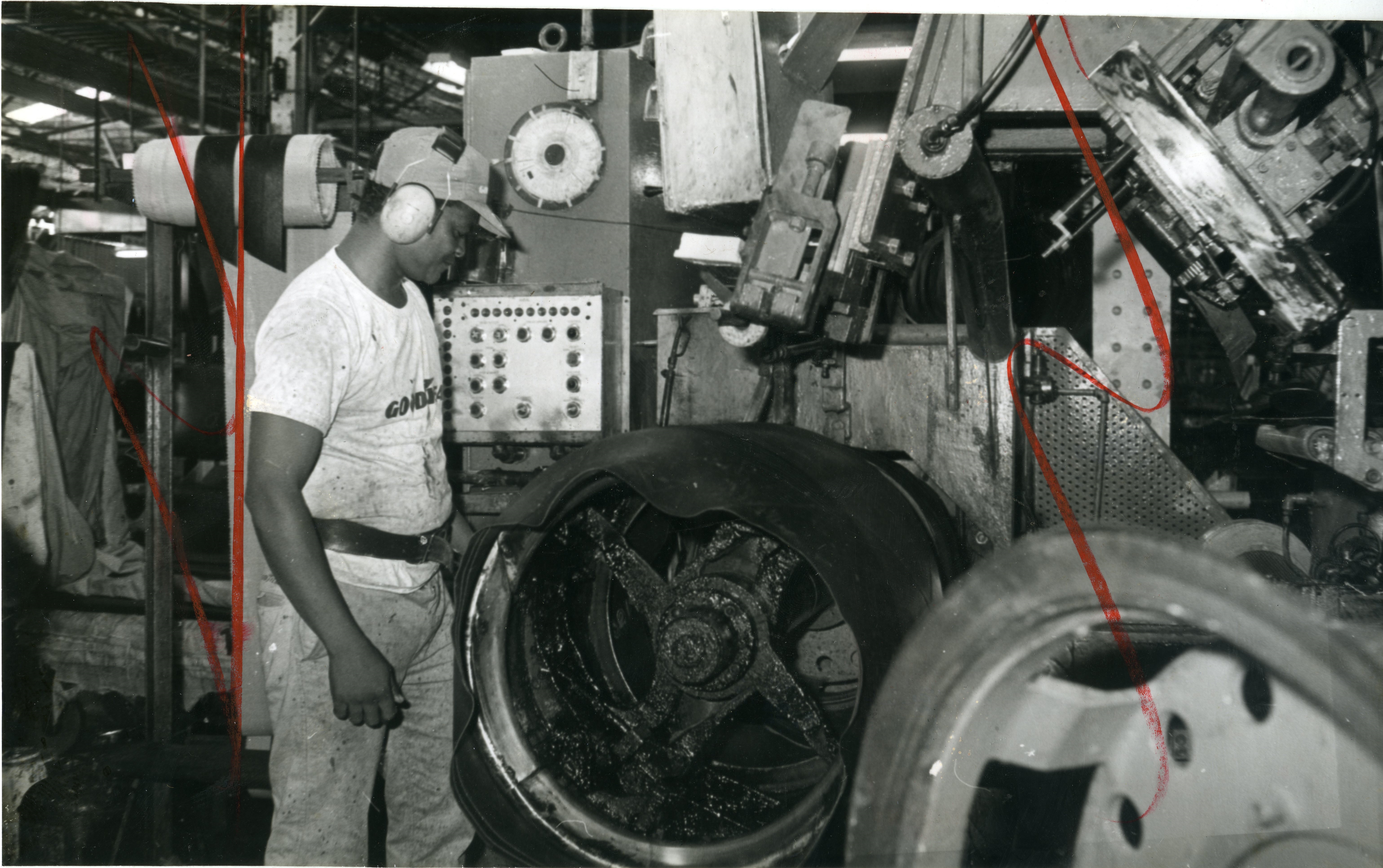 Operario manejando maquinaria al interior de las instalaciones de la fábrica de llantas Good Year.