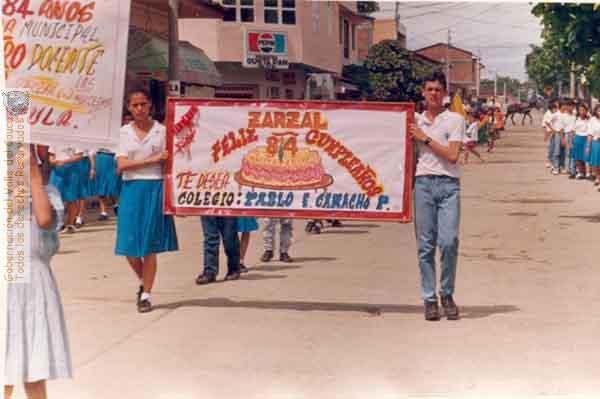 LUIS ANTONIO PEREA (1993). Desfile de colegiales portando pancartas alusivas a la celebración de los 84 años de vida municipal de Zarzal & 602280. ZARZAL: Biblioteca Departamental Jorge Garces Borrero.
