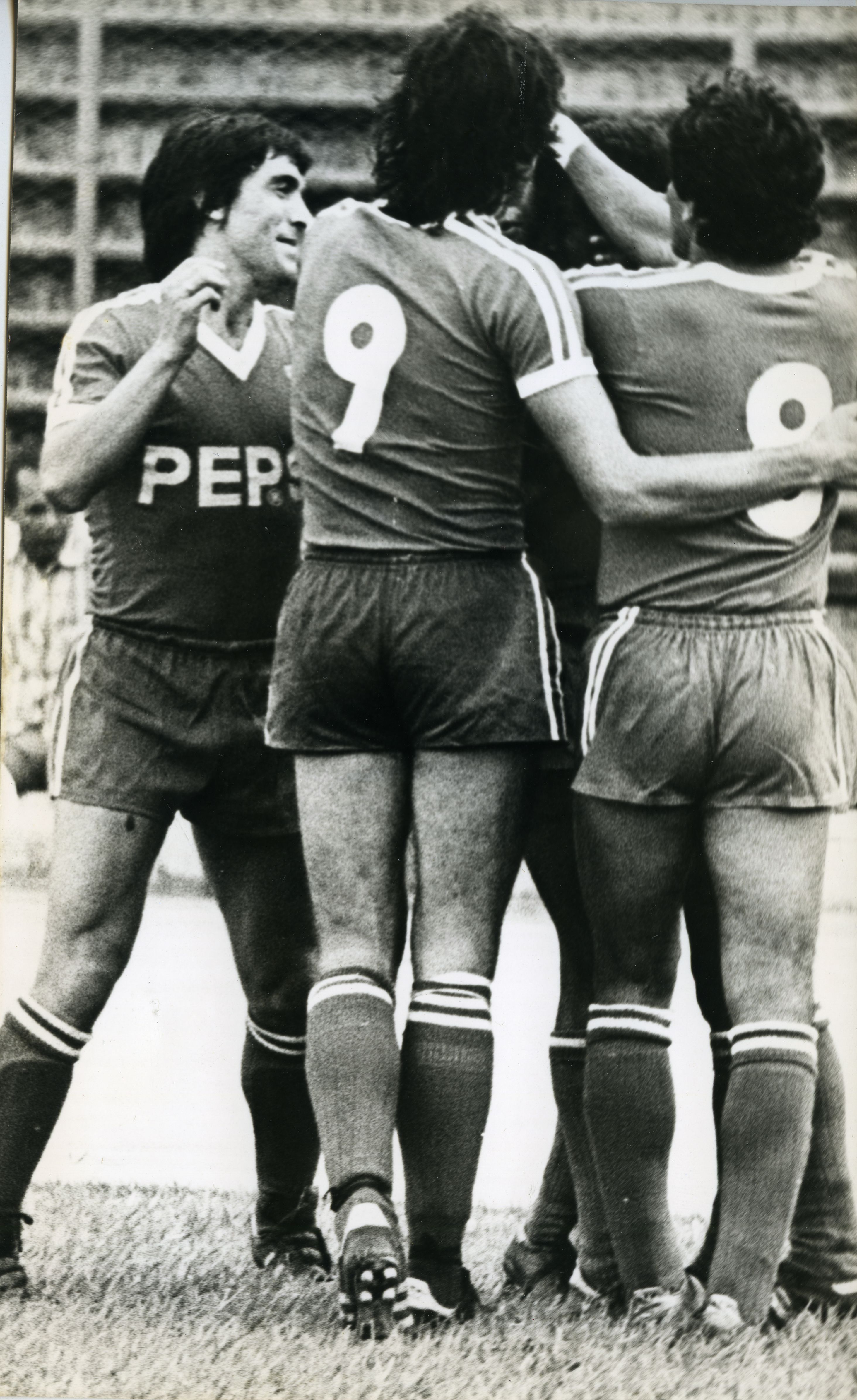 En la gráfica se observa a Roque Raúl Alfaro, futbolista, celebrando con otros jugadores en la cancha.