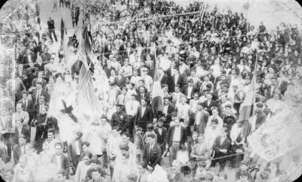 Voluntarios para el ejército que pelearían en el conflicto con el Perú. Fue una particularidad que el reclutamiento contó con un número muy significativo de hombres que se presentaron como voluntarios en todo el territorio nacional. La defensa de la soberanía se convirtió en una gran demostración del sentimiento hacia la patria. Sevilla. C. 1931.