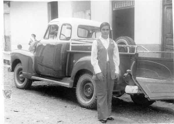 María Londoño, detrás la camioneta Ford de la familia. Pradera, fecha aproximada, 1971.