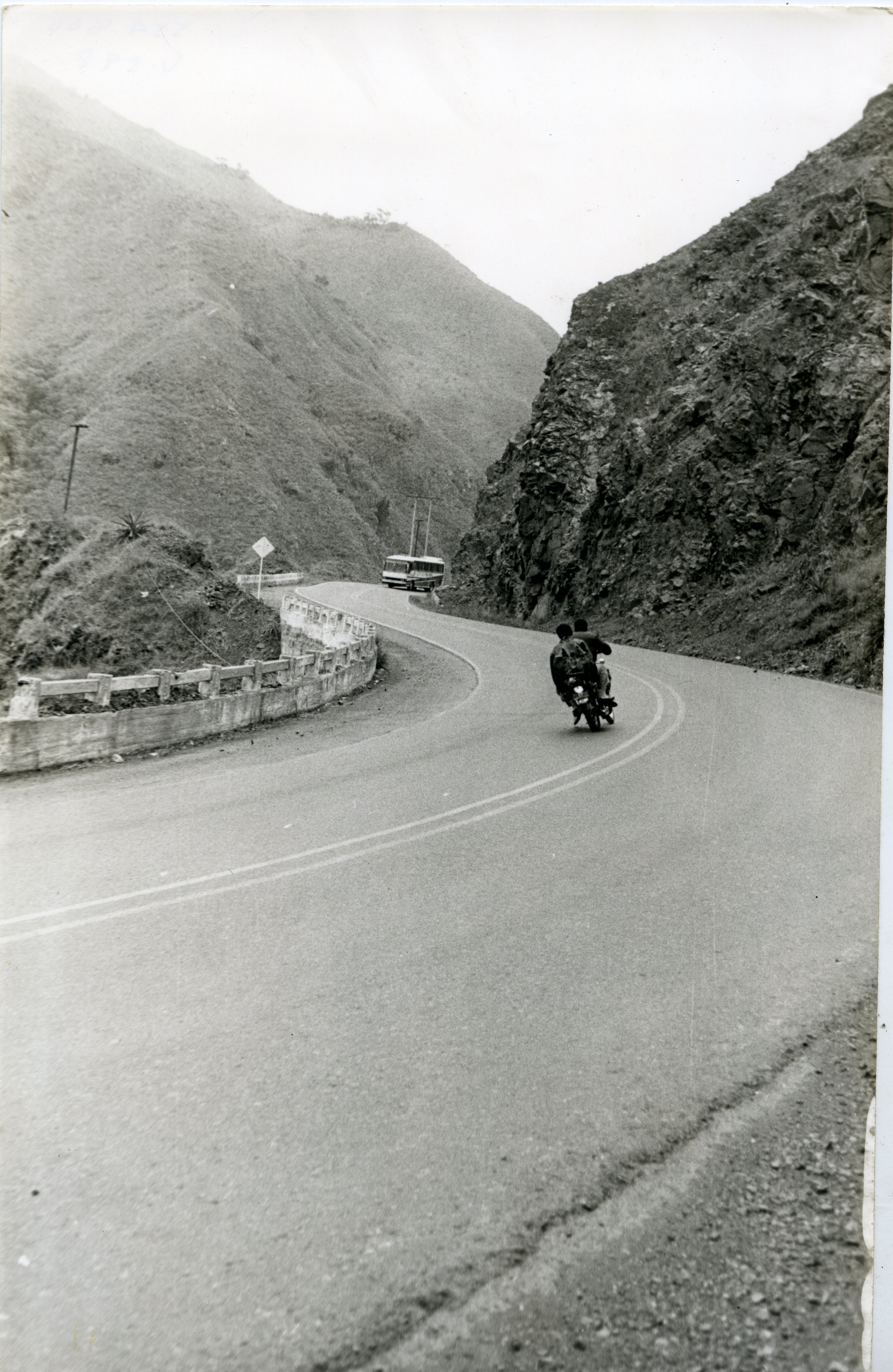 Motociclistas en la carretera que lleva al Mar, al fondo bus.
