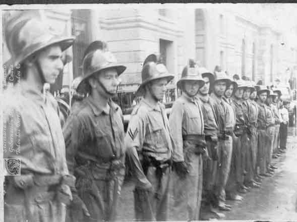 Formación en el Parque Caycedo, el 12 de octubre después de una maniobra. De izquierda a derecha. Gustavo Velazco, Luis B. Arzayuz, José Aparicio, Jorge García y Pedro Alvarez del Pino. Cali. C. 1945.