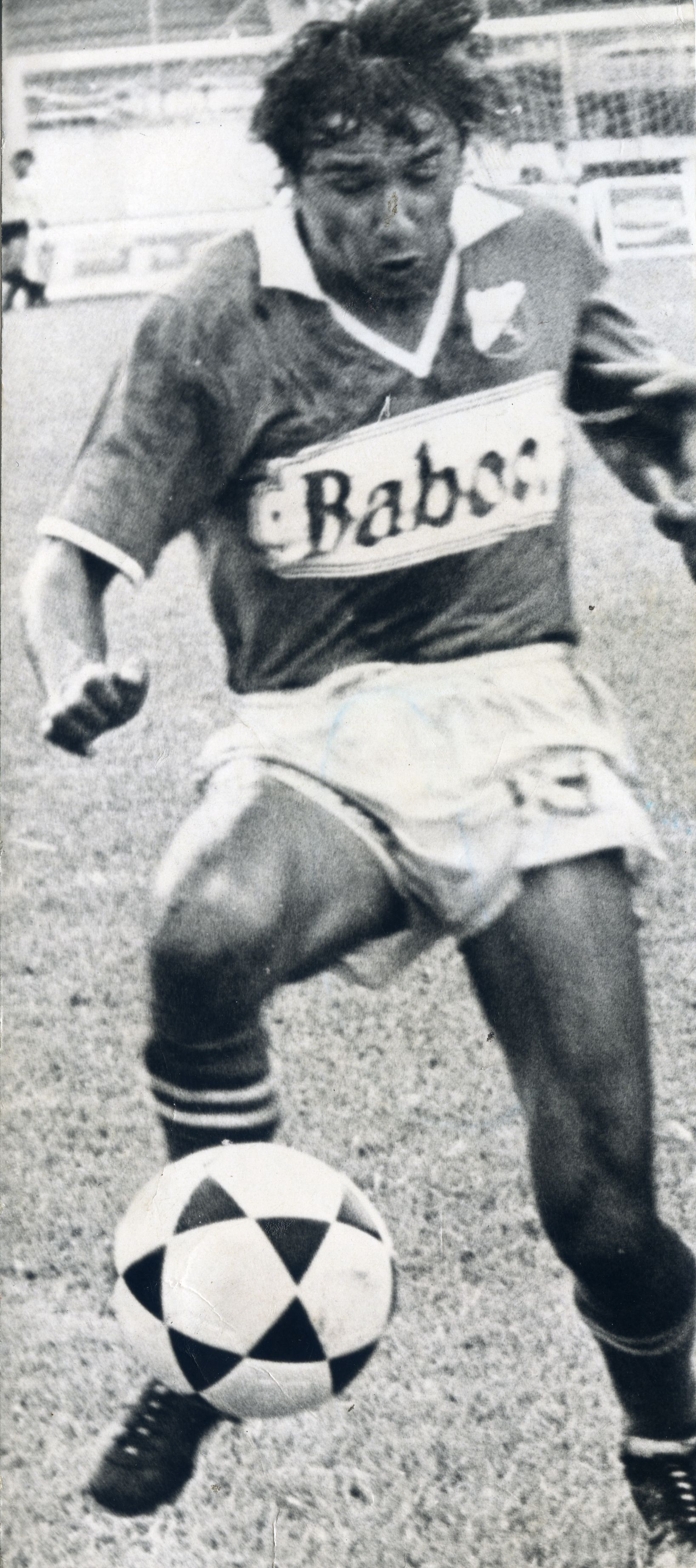 Moisés Pachón, es un exfutbolista y entrenador colombiano que se desempeñó como lateral y jugó en Independiente Santa Fe, Deportivo Cali, Millonarios, y en Deportivo Pereira.Se aprecia al jugador controlar el balón. Observamos en la camiseta que dice Baboo