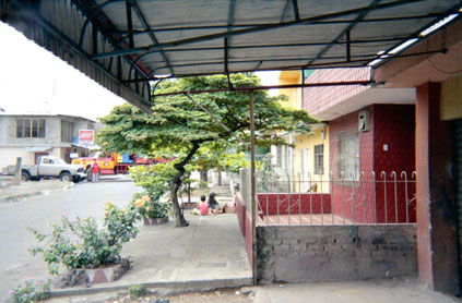 Plano general. Exterior día. Niños jugando en acera en enfoque central inferior. Carro dispendador de bebidas de fondo. Cubierta de casa en primer plano en franja superior.