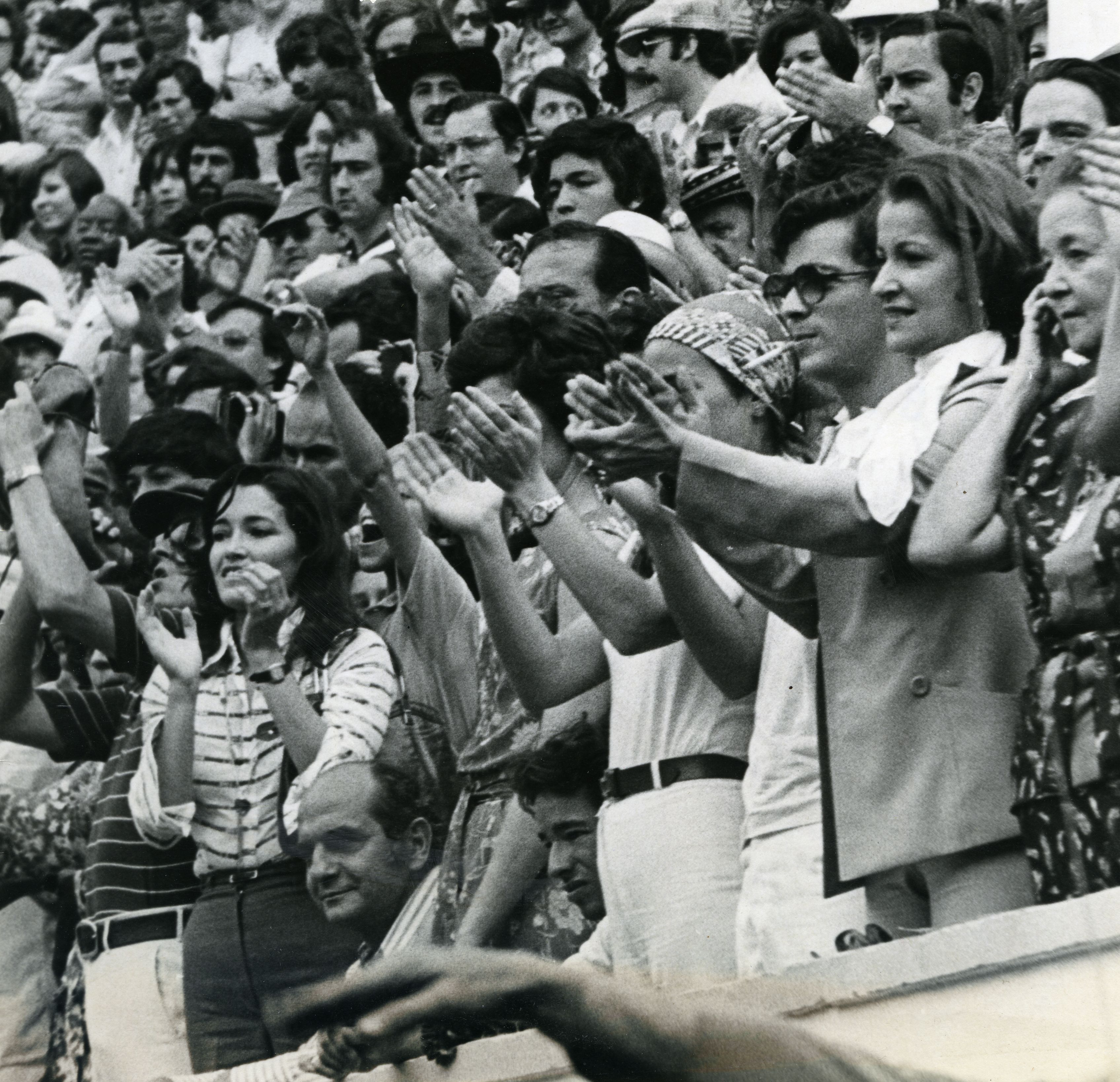Aficionados taurinos en la plaza de toros de Cali. Se aprecia al público sonriendo, feliz y aplaudiendo