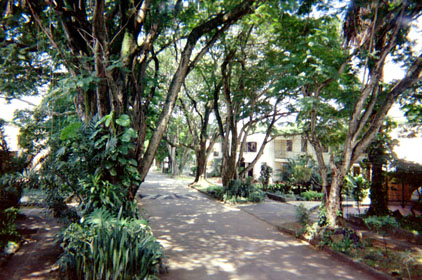 Plano general. Exterior día. Perspectiva de calle con profusa vegetación. Formación de arco natural. Conjunto de casas, entre árboles.