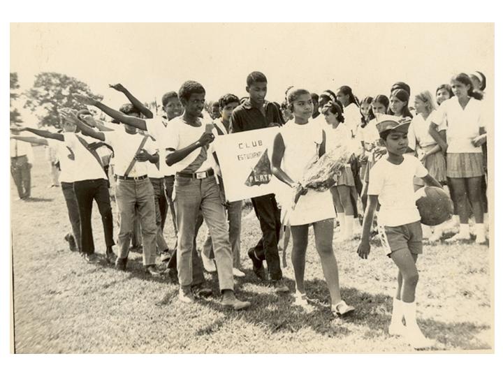 Foto Angel (1971). Grupo de estudiantes deportistas en la inauguración de los juegos en la antigua cancha de futbol en Sachamate & A841. JAMUNDI: Biblioteca Departamental Jorge Garces Borrero.