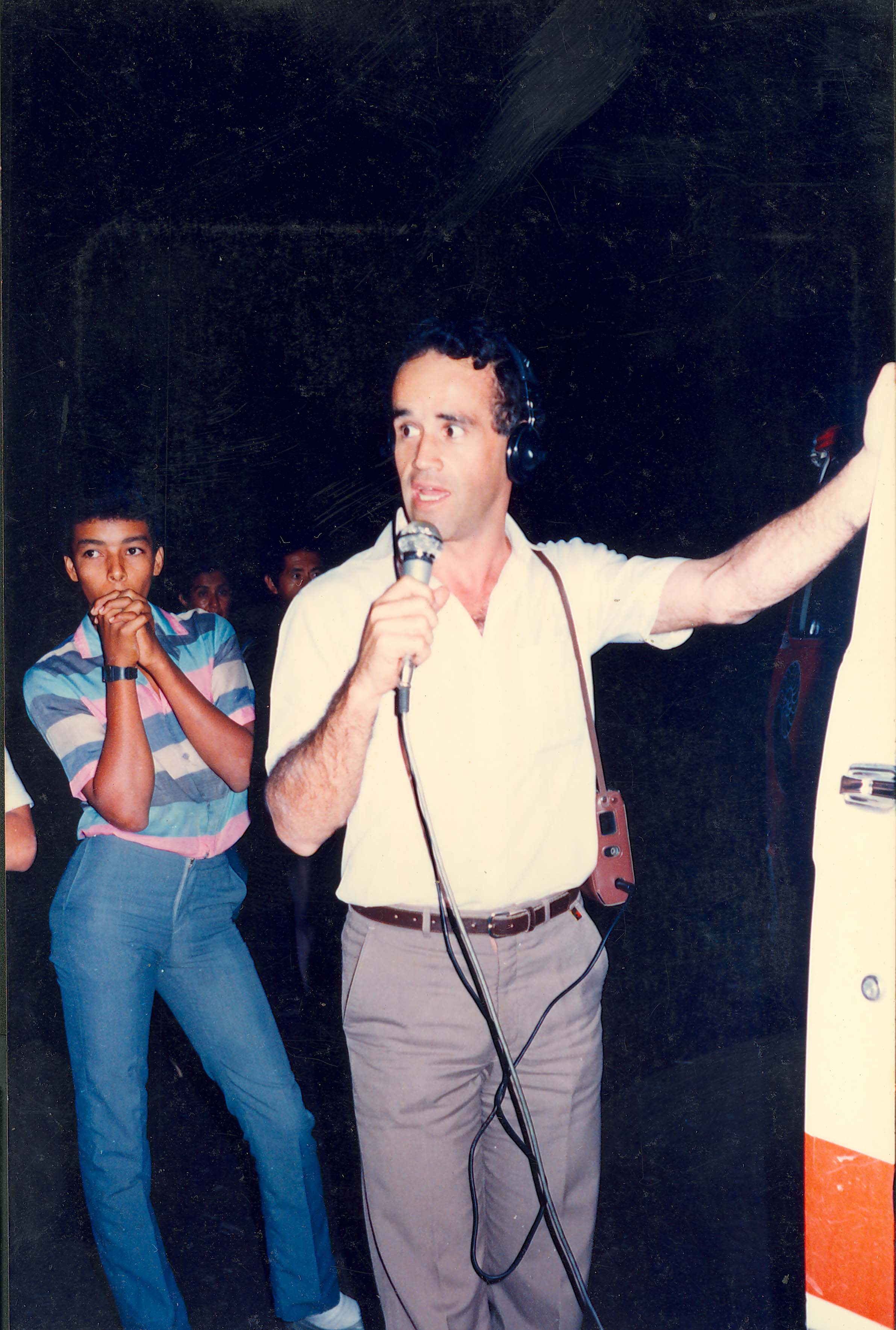 Ginebra, Valle del Cauca. Fundado en 1909. Municipio desde 1954. Economía importante en agricultura, Gastronomía, Ganadería entre otros. Atractivo turístico: Puente Natural Puentepiedra, Iglesia Nuestra Señora del Rosario, Festival “Mono Núñez”. Casa del período Republicano. Observamos en la imagen, transmisión radial callejera. Se aprecia al padre Gonzalo Gallo