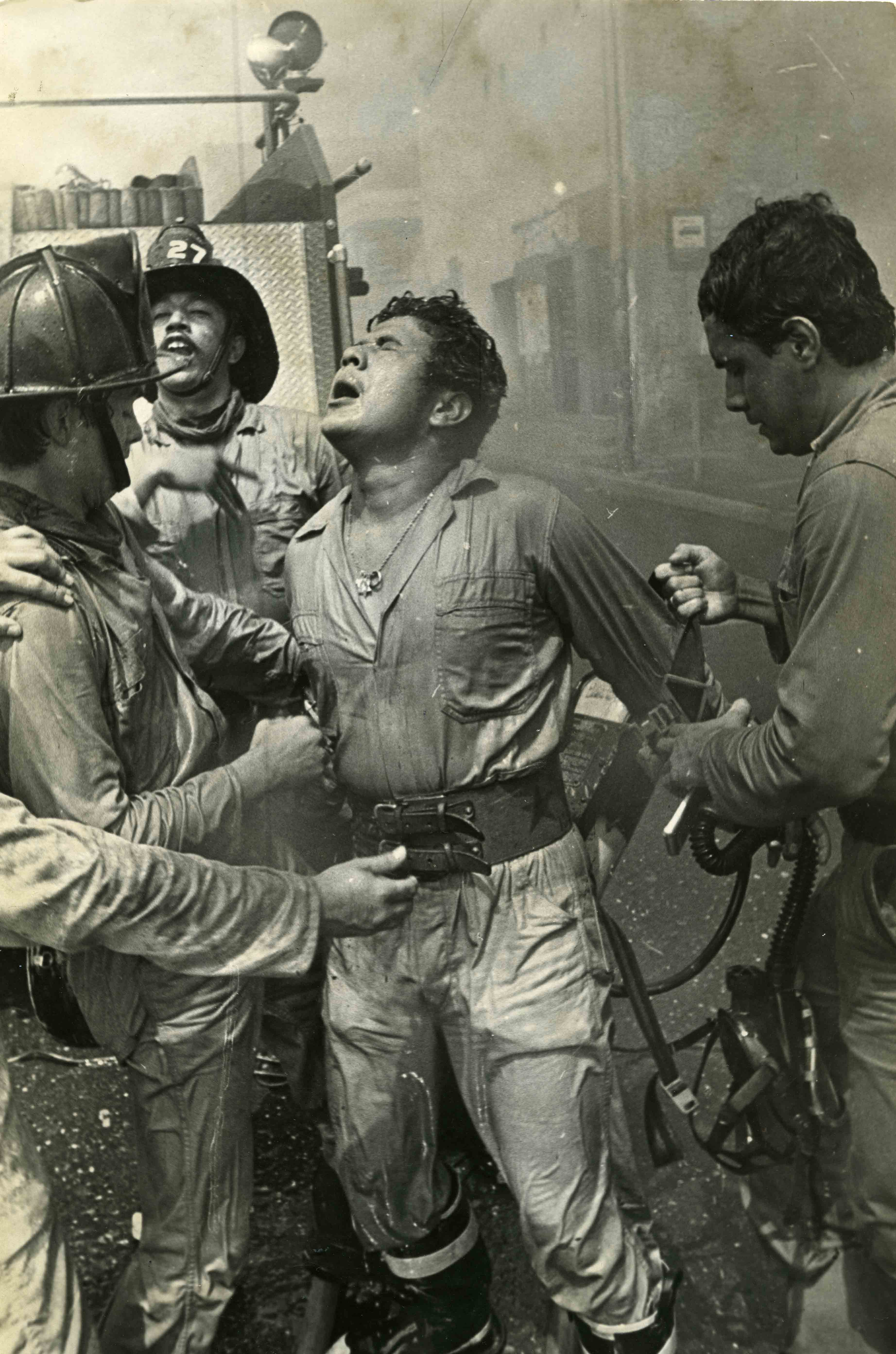 En el el pie de foto dice lo siguiente: Rostro de la tragedia. Casi ahogado por la acción de las llamas y el humo, este bombero recibe el auxilio de sus compañeros durante las operaciones de extinción del fuego ayer durante el pavoroso incendio en un almacén distribuidor de calzado. La conflagración, que arrojó pérdidas por más de 25 millones de pesos se produjo en la distribuidora Disfabriles, en la calle 13 con carerra 9a de esta ciudad.- El Archivo del Patrimonio Fotográfico y Fílmico del Valle del Cauca es responsabilidad de la Biblioteca Departamental del Valle Jorge Garcés Borrero, por convenio de cooperación suscrito con la Secretaria del Cultura Departamental, con el fin de aunar esfuerzos para su conservación, preservación y divulgación del Archivo entre la comunidad Vallecaucana, especialmente entre los estudiantes e investigadores que visitan la Biblioteca, propiciando el su uso y consulta permanente. La universidad Icesi es un colaborador en el proceso de difusión, facilitando la tecnología que permite la consulta de las imágenes.