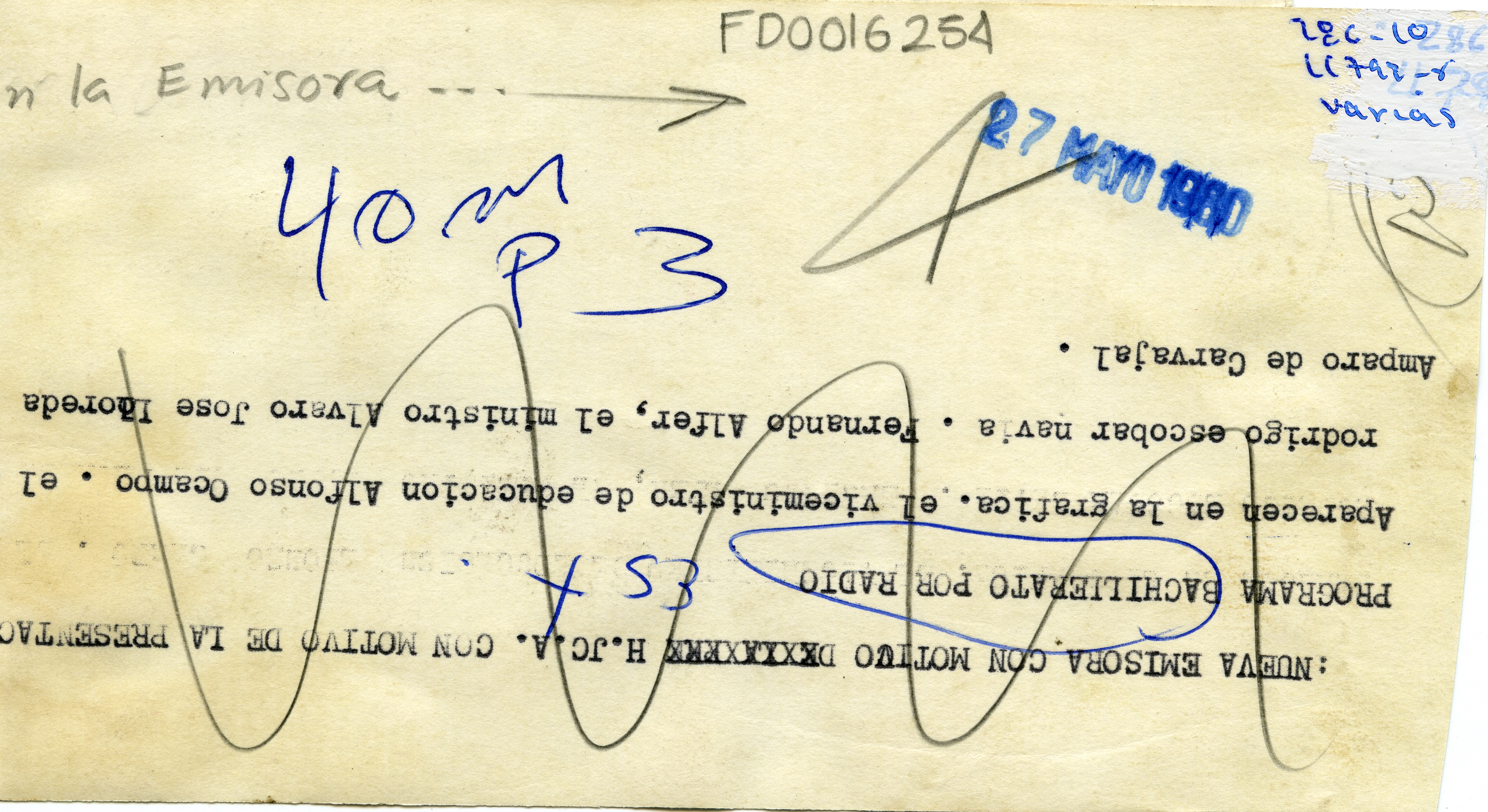 Al reverso de la fotografía dice " NUEVA EMISORA CON MOTIVO DE LA PRESENTACIÓN PROGRAMA BACHILLERATO POR RADIO. Aparecen en la gráfica el viceministro de educación Alfonso Ocampo. Rodrigo escobar navia. Fernando Alfer, el ministro Álvaro José Lloreda, Amparo de Carvajal" El escrito está entrecortado