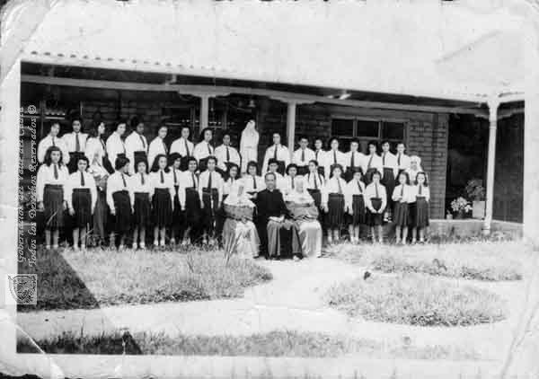 El Presbitero Luis H. Ramírez con un grupo de alumnas, este tipo de fotografías forman parte de la tradición de nuestros pueblos.Calima-Darién C. 1960