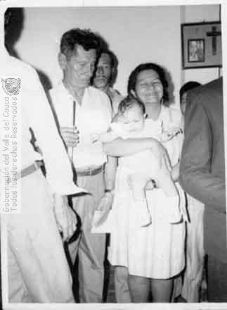 Benicia Varela, Sixta Mazuera y otras personas por identificar en el bautizo de un bebé. zarzal. C. 1970.