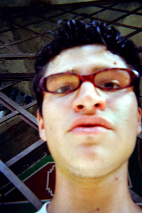 Primer plano de un hombre joven con gafas y su mirada dirigida hacia la cámara. Sobre el rostro de él se refleja la luz del sol, que incide desde el extremo superior derecho. Al fondo una reja de color café. La imagen está desenfocada.