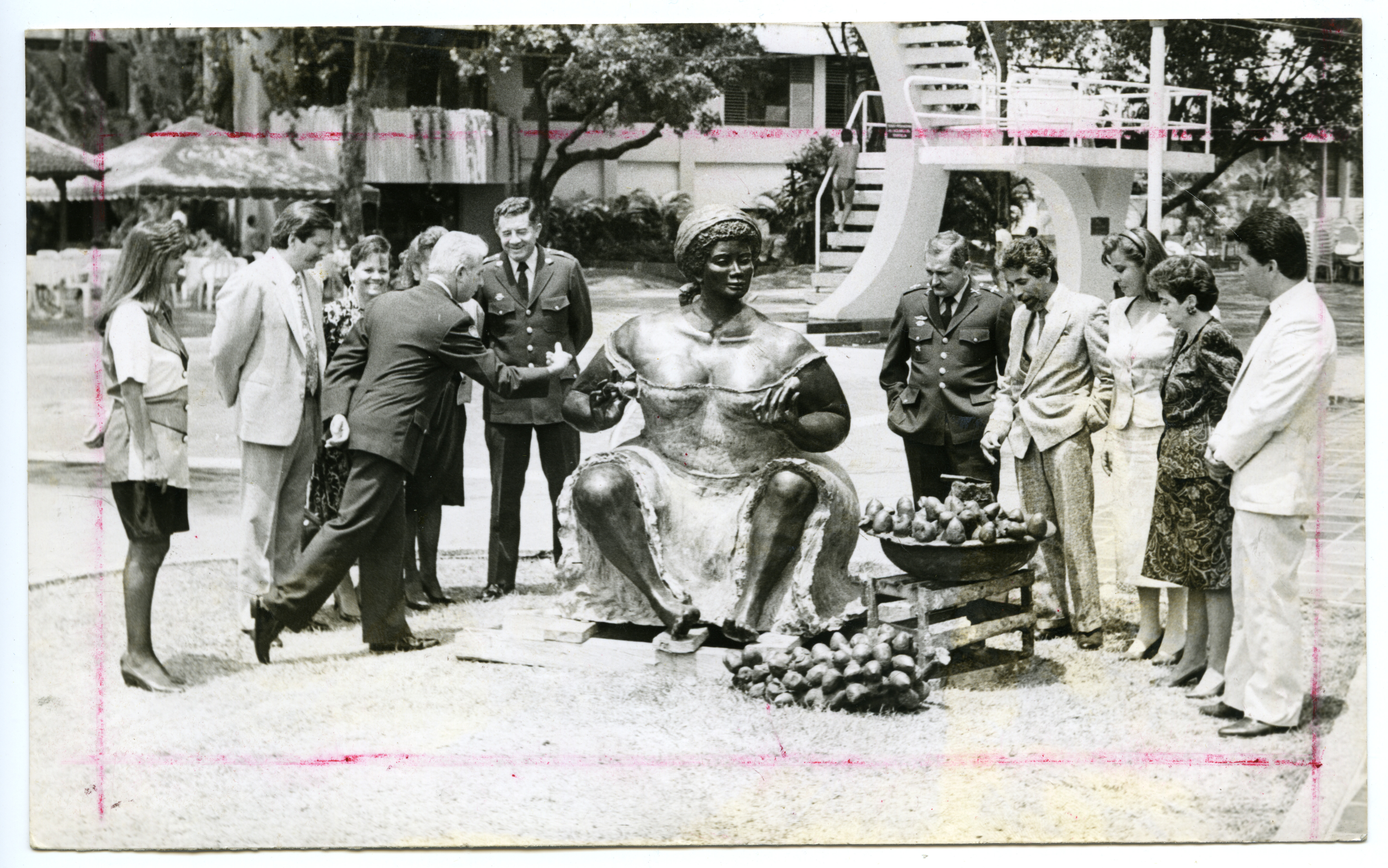 Escultura de la Negra del Chontaduro en el Club San Fernando. Información al reverso:Aparecen en la gráfica, entre otros el doctor Fabio Rodríguez, presidente del Club y Anita de Rodríguez; coronel Alirio Muñoz, jefe de Estado Mayor de la III División del Ejército; brigadier general Victor Arevalo, comandante de la III Brigada; María E. González, gerente del Club; mayor general Hernando Camilo Zúñiga, comandante de la III División del Ejército; Nur Cure, jefe de Comunicaciones del Club; Gerardo Ramírez y señora, Diego León Márquez y Yolanda de Márquez