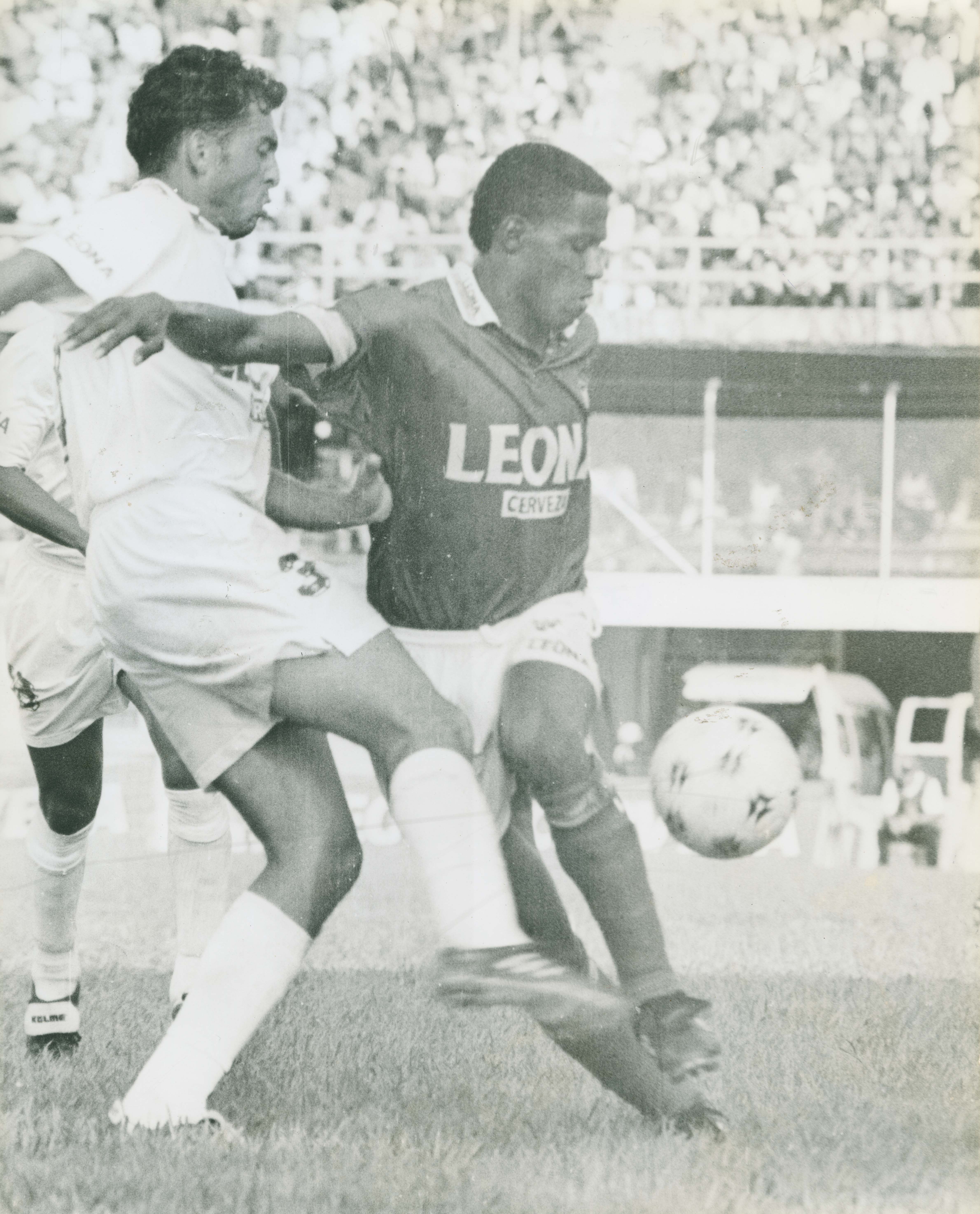 Diario Occidente (1995). Víctor Bonilla disputando el balón con Andrés Quintero. Santiago de Cali: Biblioteca Departamental Jorge Garcés Borrero.