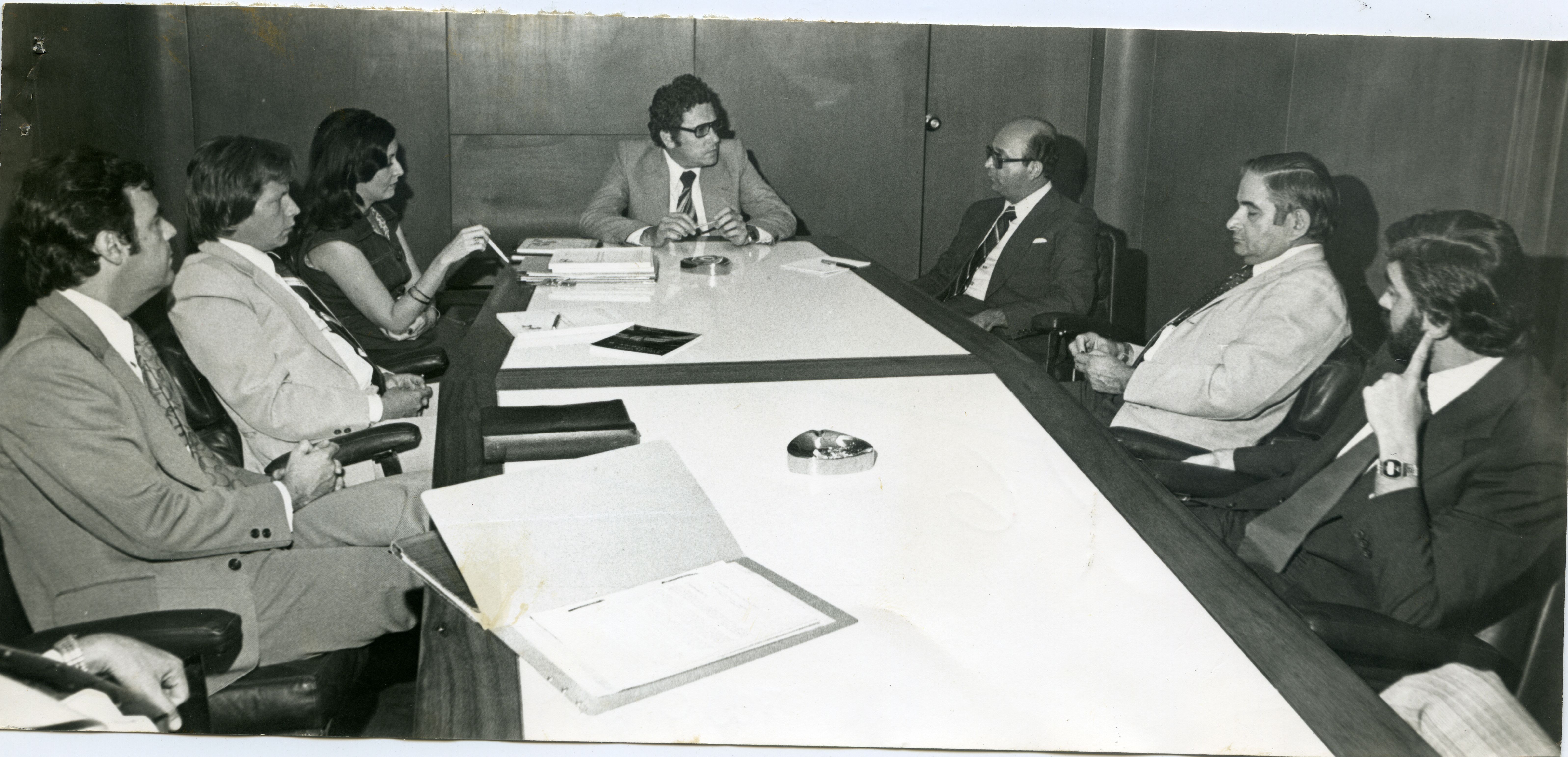 Fotografia de plano medio largo de Carlos Holguin Sardi, donde lo podemos apreciar de saco y corbata, sentado al inicio de una mesa, con varias personas a al lado de cada costado, podemos ver con claridad a una mujer que hace parte de esta reunión y que esta al costado derecho del doctor Sardi.