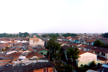 Plano general de ciudad. Exterior día. Punto de vista de la parte alta de alguna edificación. Vemos la regularidad de los techos de las casas y la línea del horizonte con árboles al fondo perfectamente delineada.