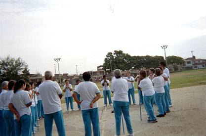 Plano medio. Exterior dìa. Práctica deportiva de personajes, formando circulo. Sobresale vegetación y conjunto de casas de fondo. División de escena en dos bloques.