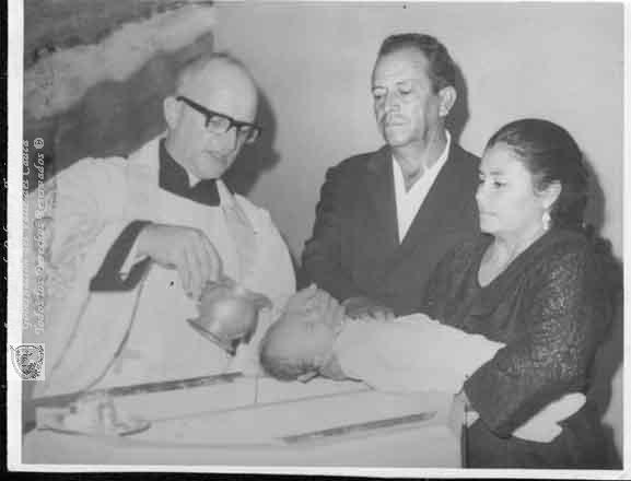 La familia García en el bautizo de su hijo, celebrado por el sacerdote Navarro. El cumplimiento del sagrado sacramento del Bautizmo, es tradición cultural que las familias trasmiten de generación en generación. La Unión, C. 1950.